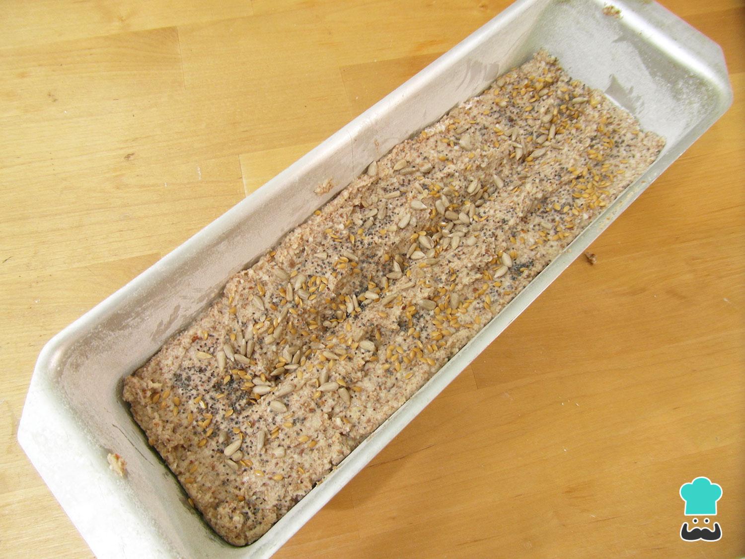 Pasado este tiempo, engrasar un molde con aceite y harina sin gluten. Poner la masa del pan salado de harina de coco alisándola bien con una cuchara o espátula. Hacer un corte por la mitad y, si te gusta, espolvorear una mezcla de semillas (en este caso utilicé semillas de girasol, semillas de lino y semillas de amapola) por encima. Cocer el pan fitness en el horno precalentado a 200 °C durante 1 hora.