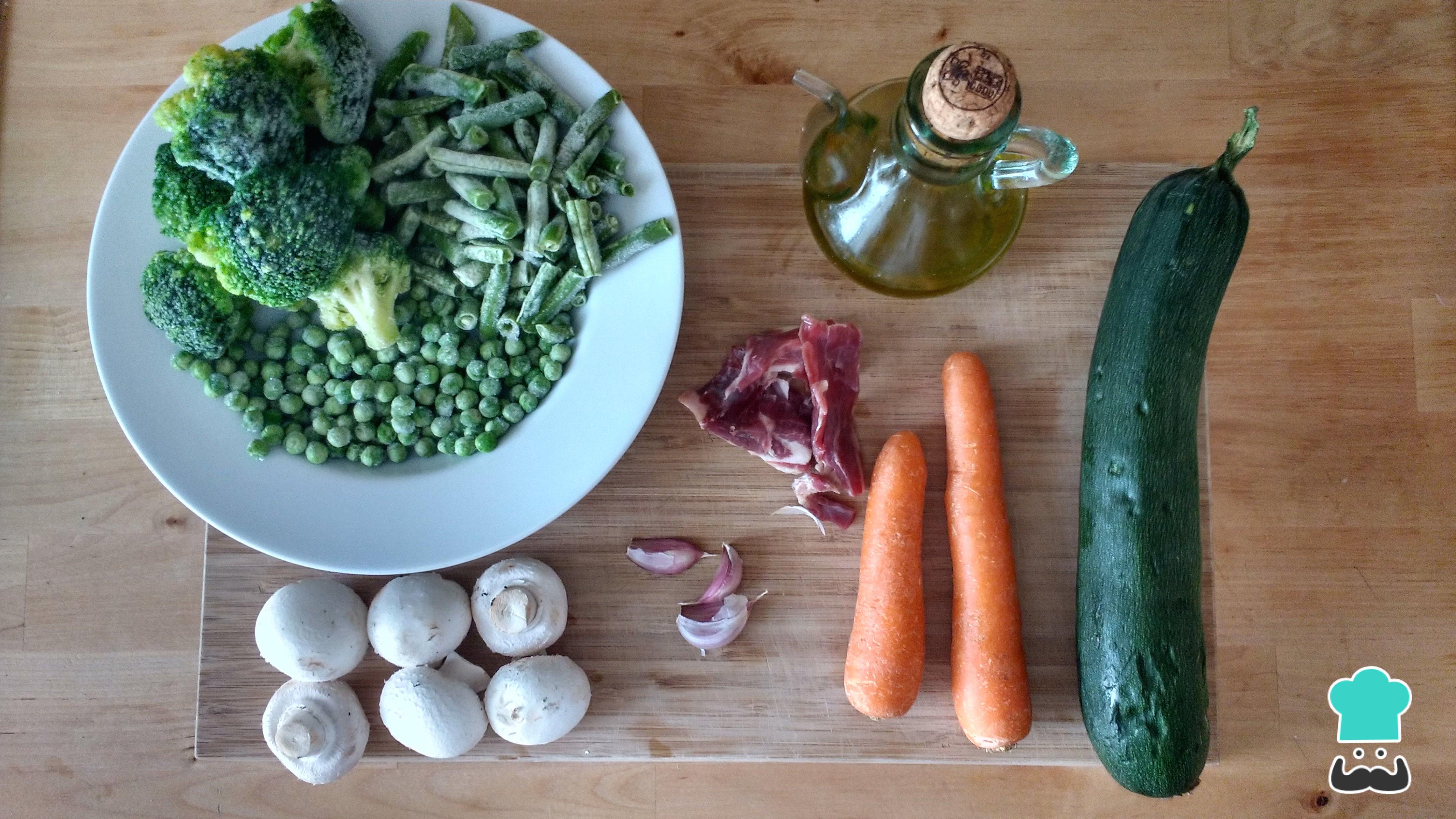 Reunimos todos los ingredientes para preparar el panache de verduras. Para esta receta hemos utilizado algunas verduras congeladas como las judías verdes, el brócoli y los guisantes. Pero recordad que siempre podéis usar verdura fresca.