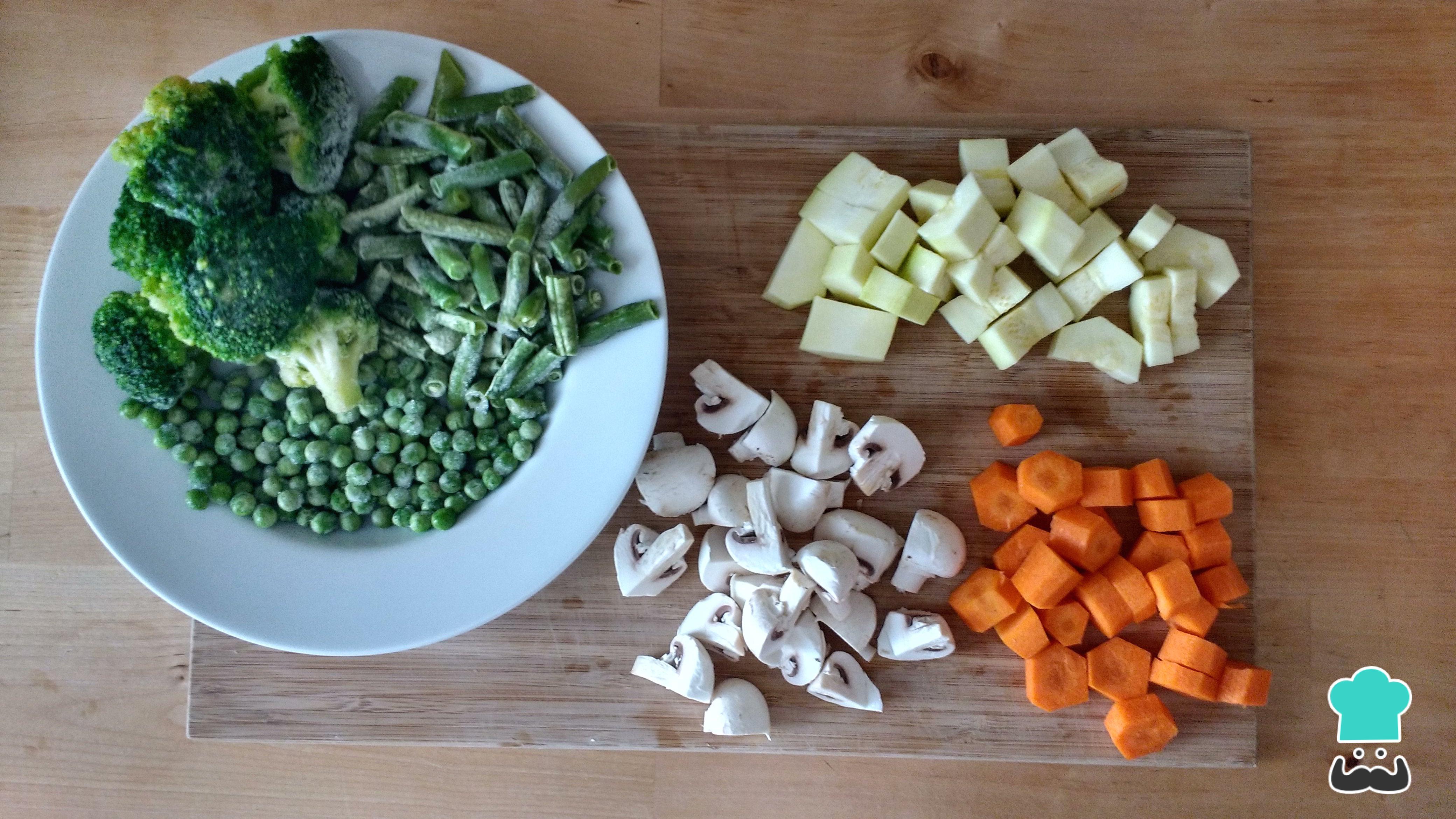 Las judías verdes y el brócoli ya estaban troceados, de lo contrario es necesario cortarlos también.