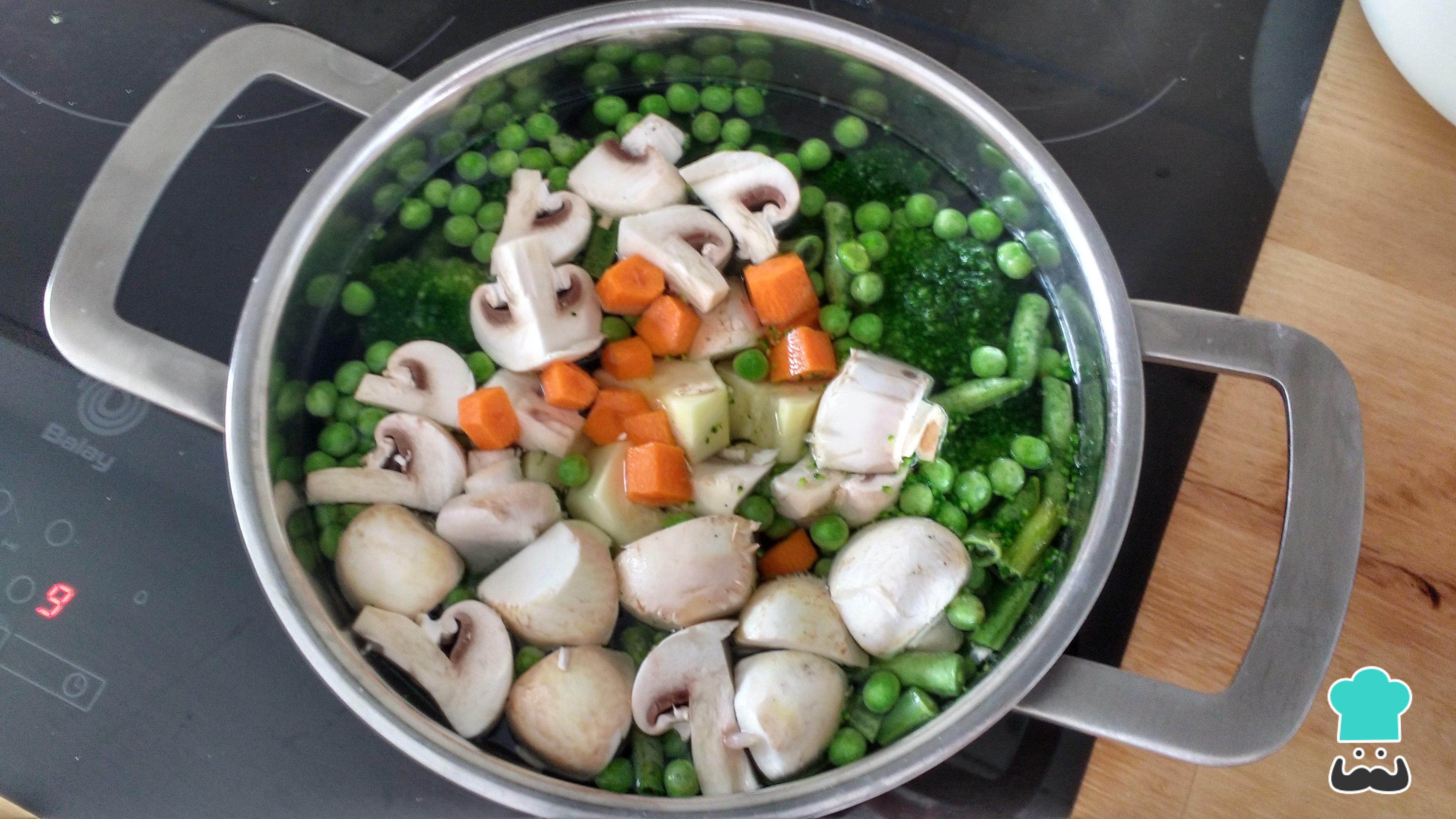 Si tenéis tiempo, podéis cocer por ejemplo, las judías, el brócoli y las zanahorias por una parte; y los guisantes, el calabacín y los champiñones por otra.