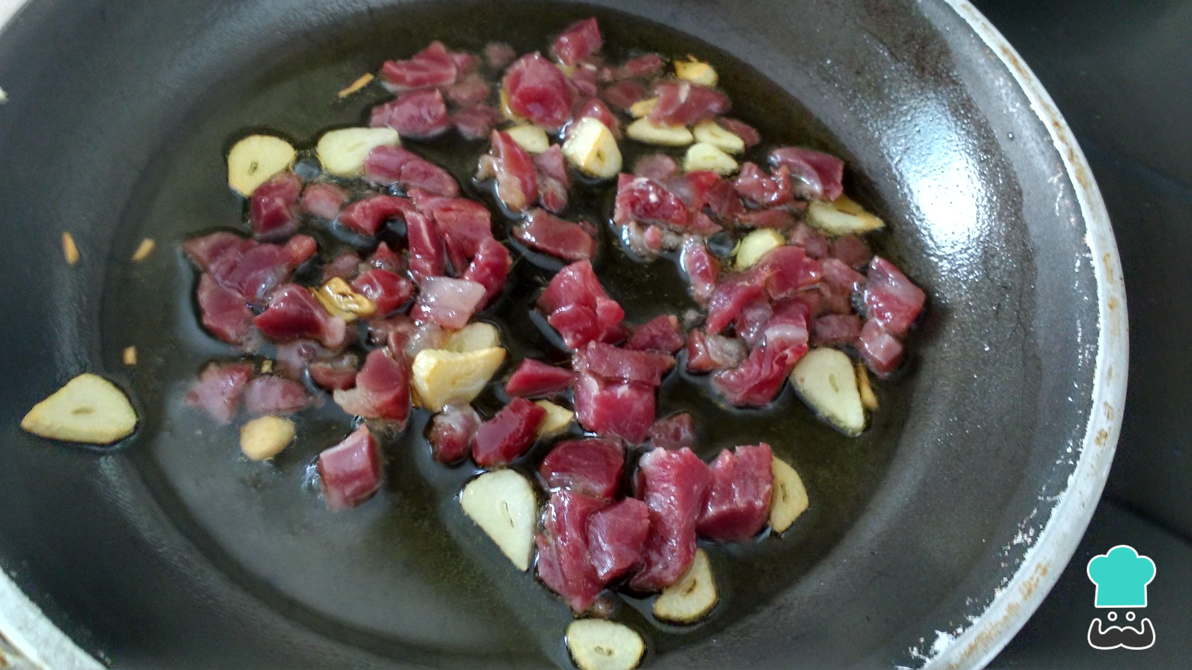 Sofreímos el ajo fileteado en una sartén con un poco de aceite de oliva. Cuando esté dorado, añadimos el jamón cortado en taquitos pequeños y retiramos del fuego.