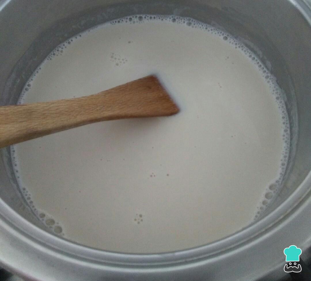 Se pone a calentar medio vaso de leche y dos cucharadas soperas de azúcar, y cuando esté a punto de hervir, se retira de l fuego, añadimos un bric de nata de 200 ml, y volvemos a poner a cocinar a fuego bajo moviendo con una cuchara de palo.