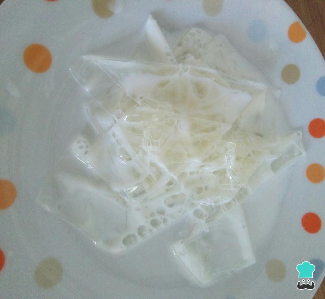 Mientras tanto ponemos tres laminas pequeñas de gelatina neutra cubiertas con agua para hidratar, durante 5 minutos.