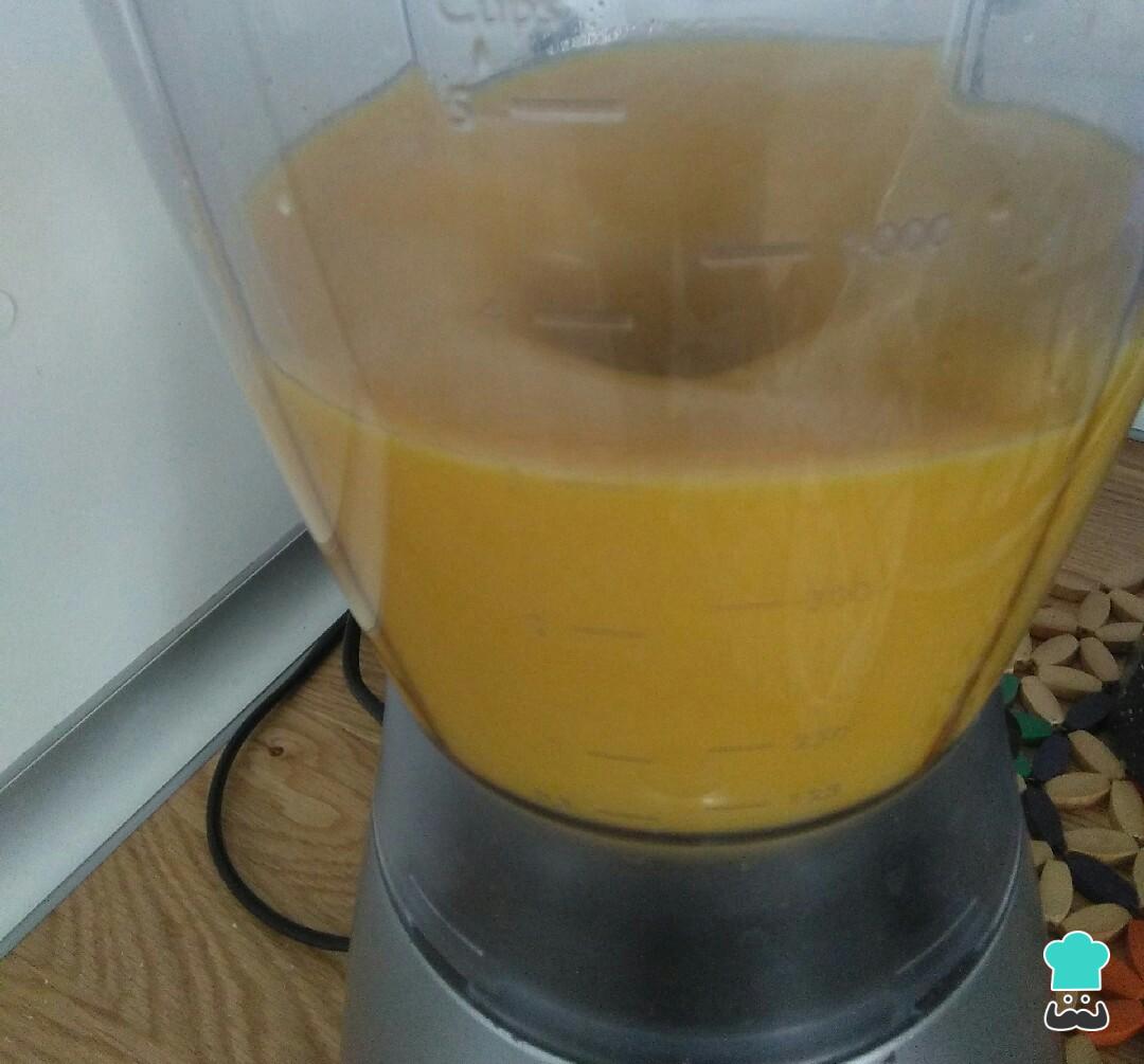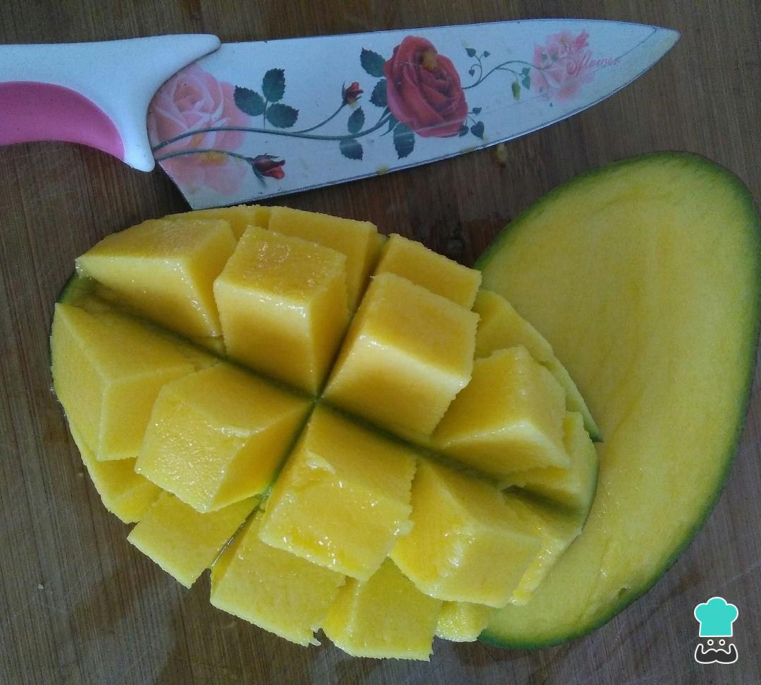 Pelamos y extraemos la carne del mango para triturar, le echaremos muy poquita azúcar que ya es opcional y al igual que dos cucharadas de brandy, dependiendo de quien vaya a degustar la panacota con salsa de mango.