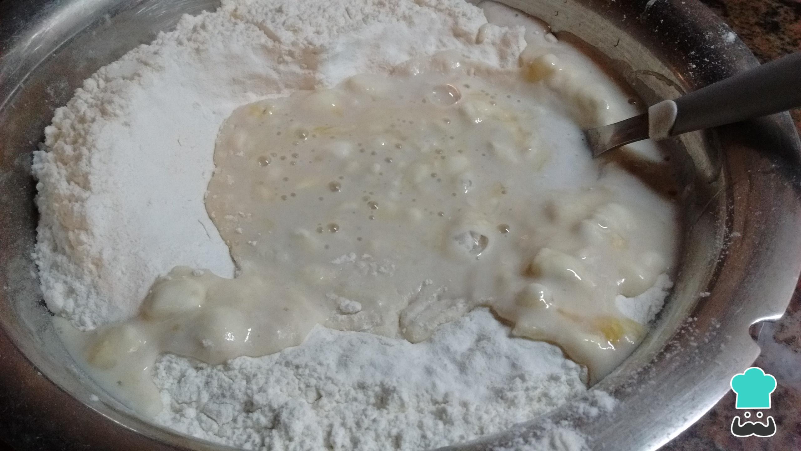 En un recipiente, dispón la harina y haz un hueco en el centro para añadir el huevo y la levadura con la leche. Comienza a integrar los ingredientes y, si es necesario, agrega el resto de la leche poco a poco hasta obtener un bollo suave y húmedo.