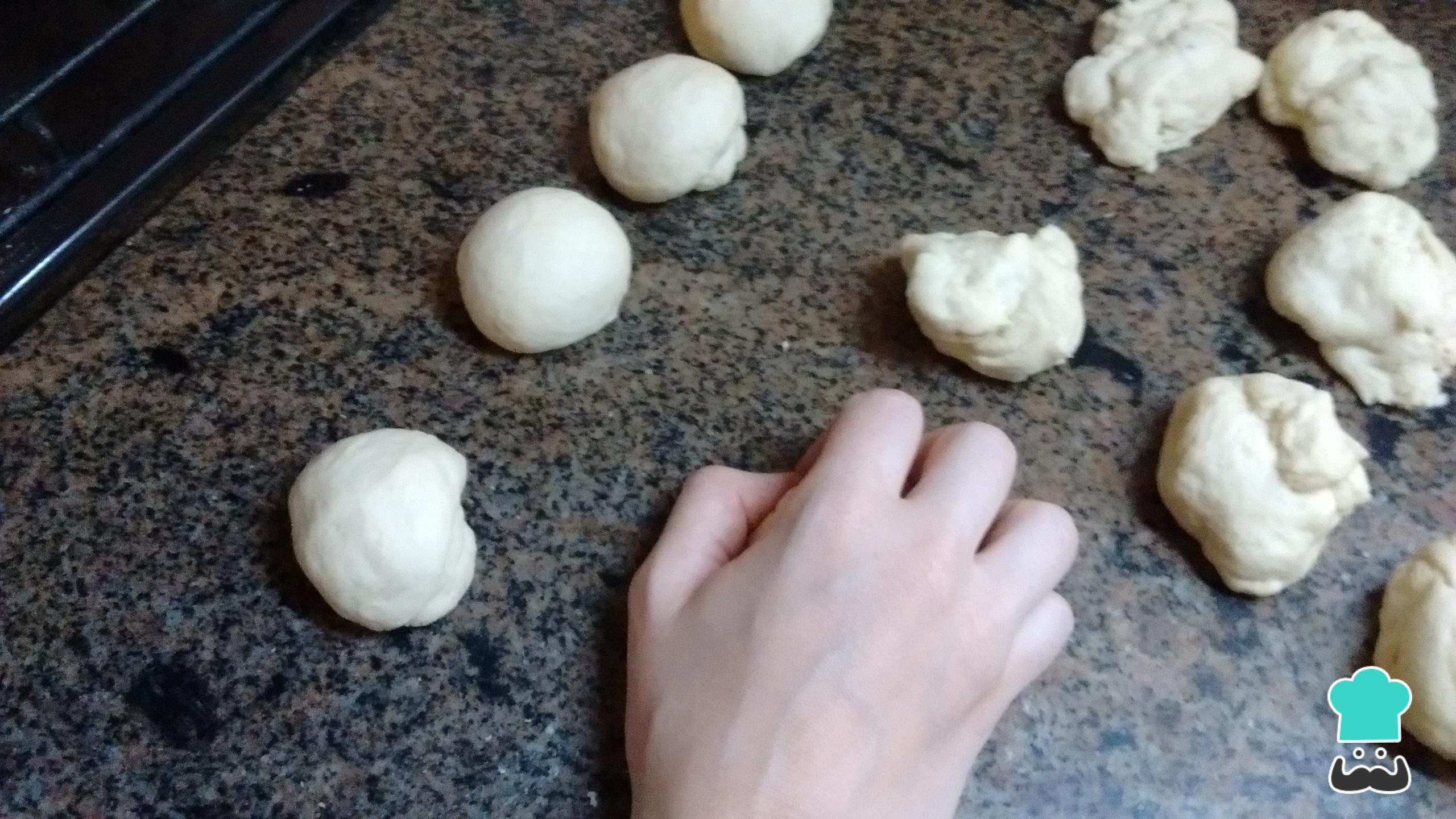 Divide tu masa en bollitos de igual tamaño. En este caso, pesan 50 gramos cada uno y hará que esta receta rinda para 14 pancitos de leche. Puedes hacerlos más grandes o más chicos y de la forma que desees.