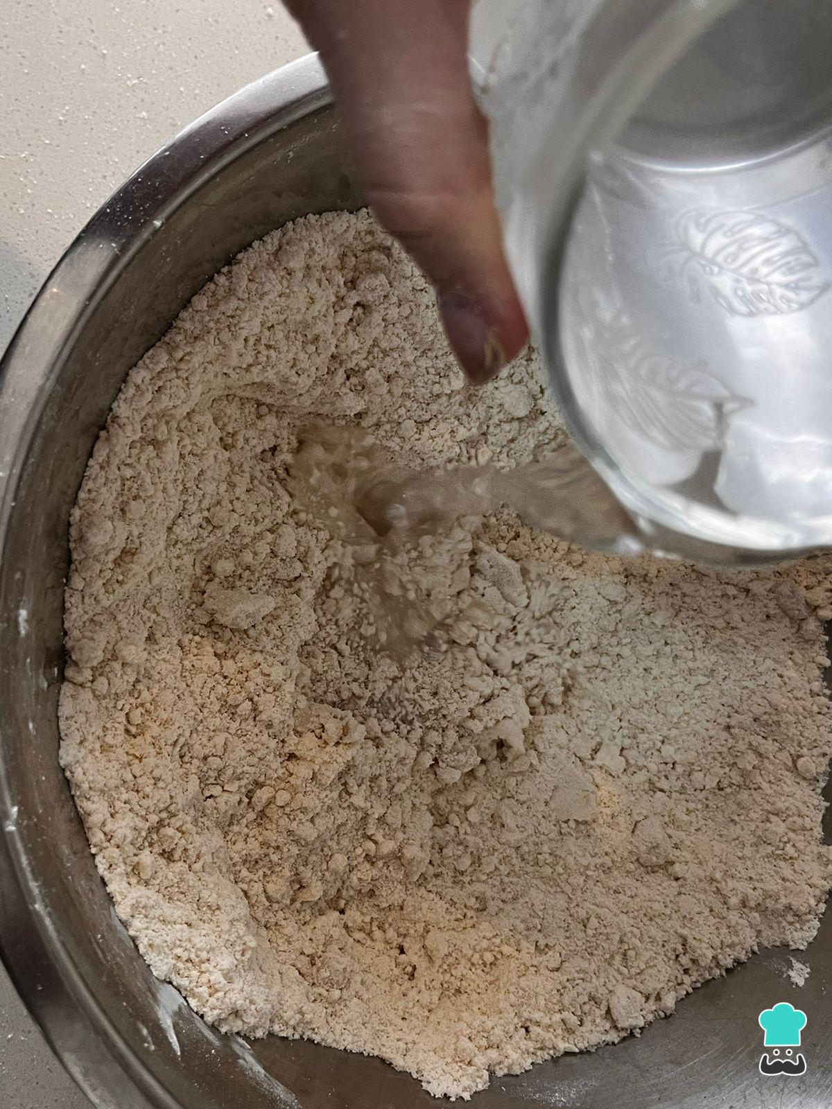 Vierte poco a poco el agua e integra con la harina. También precalienta el horno a 180 °C.