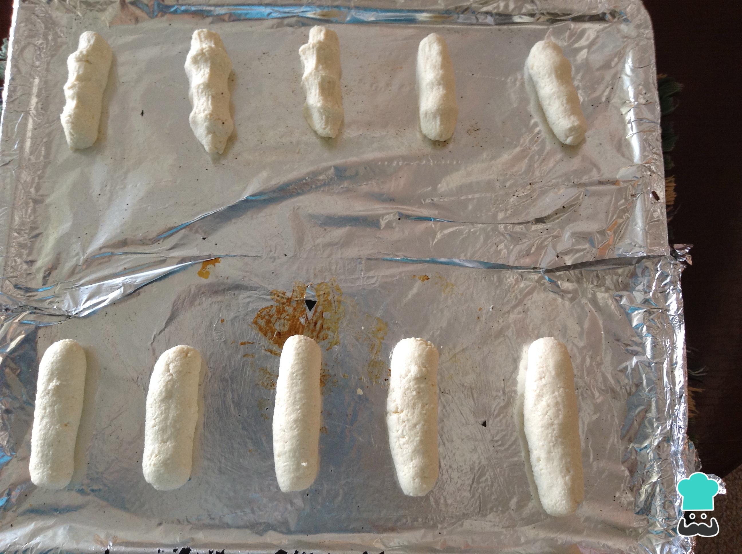 Realizar tiras gruesas con la masa y llevarlas a una lata para horno, se deben poner no muy cerca ya que nuestros pandeyucas crecen bastante.Podemos darle la forma que se quiera.