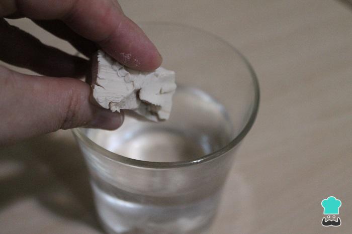 Para empezar con la receta de panecillos de calabaza, primero desmenuza la levadura fresca en el agua tibia y remueve hasta que se disuelva del todo.