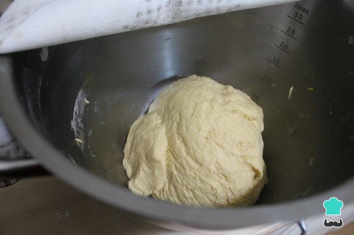 Forma una bola y cúbrela con un paño húmedo. Deja reposar durante 1 hora y 30 minutos en un lugar cálido y sin ninguna corriente de aire para que que duplique su volumen.