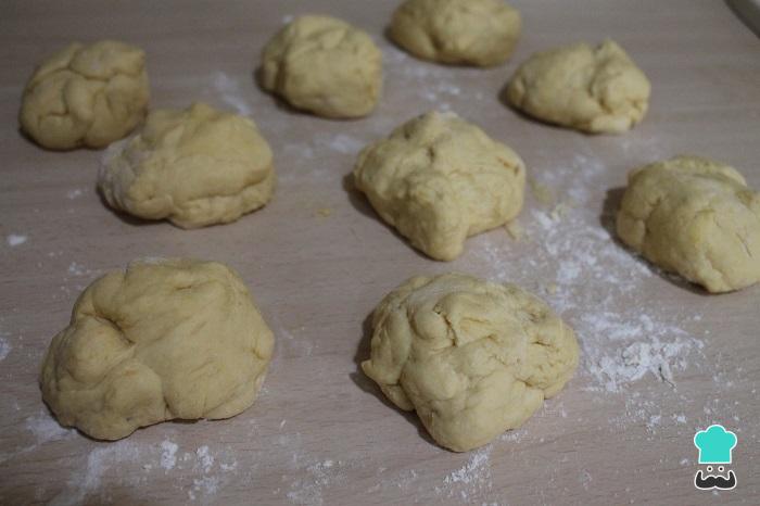 Pasado el primer tiempo de levado, pon la masa en una superficie de trabajo ligeramente enharinada y amasa un poco para quitarle el aire. Forma bolas de unos 100 g con la masa de panes de calabaza.