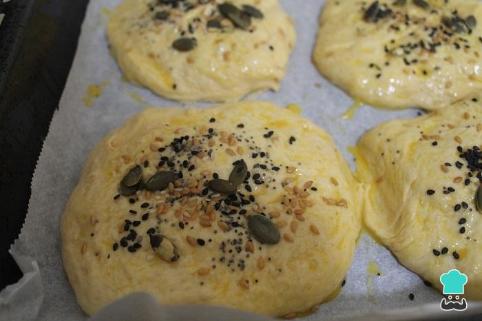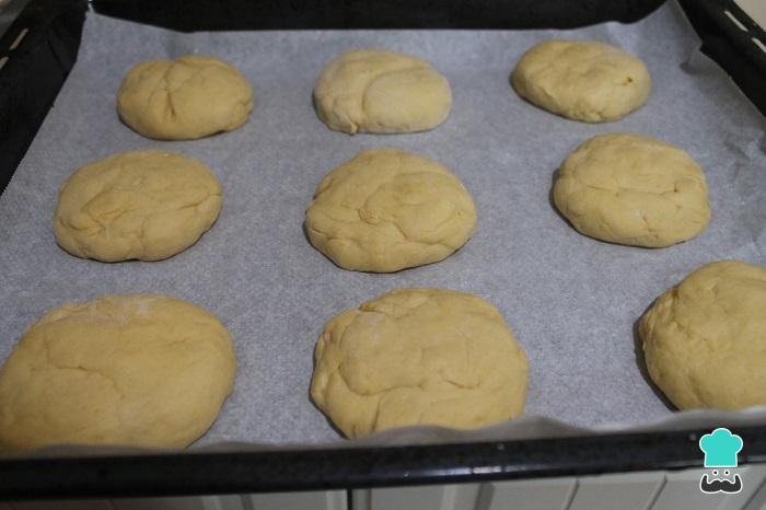 Forra una bandeja con papel de horno, pon los panecillos de calabaza encima, separados entre sí, y aplana con las manos. Luego, cúbrelos con un paño humedecido y deja reposar otra hora y media en un lugar sin corrientes de aire hasta que los panecillos vuelvan a doblar su volumen.