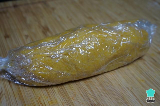 Cuando tengamos el mazapán de calabaza bien mezclado, lo enrollaremos en papel film y haremos un rulo bien apretado. Lo meteremos en la nevera un par de horas o dejaremos de un día para otro.