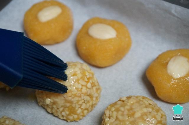 Ponemos los panellets de calabaza en una bandeja para horno, y los pintamos con ayuda de una brocha con huevo batido. Metemos al horno a 180 ºC hasta que queden dorados.