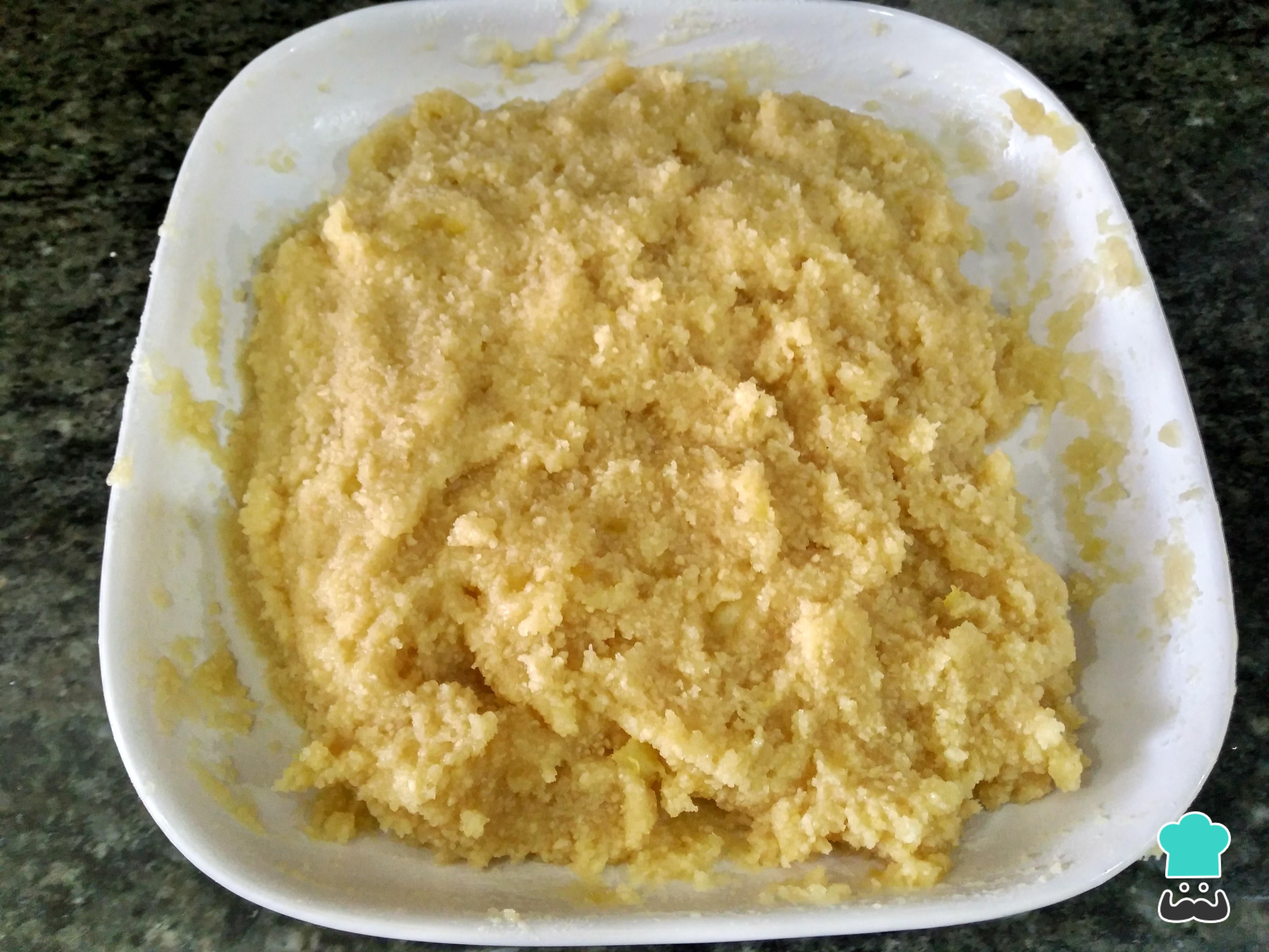 A continuación, mezclamos el puré de patatas con el azúcar glas y después añadimos la almendra molida y la esencia o el zumo de limón, y mezclamos de nuevo ligeramente.