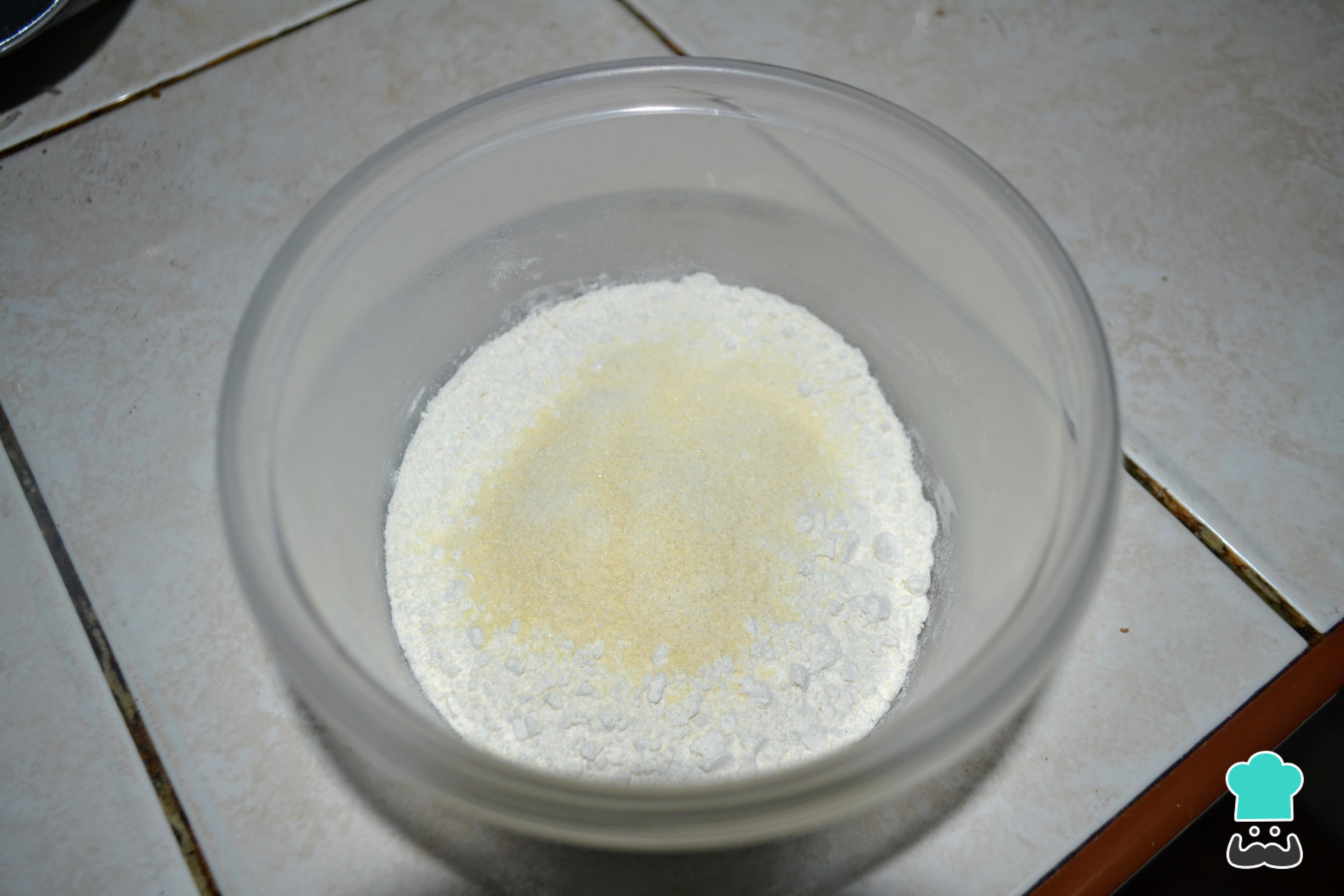 Para empezar con la receta de panettone de chocolate fácil primero en un recipiente agrega la harina especial panetonera y la levadura seca.