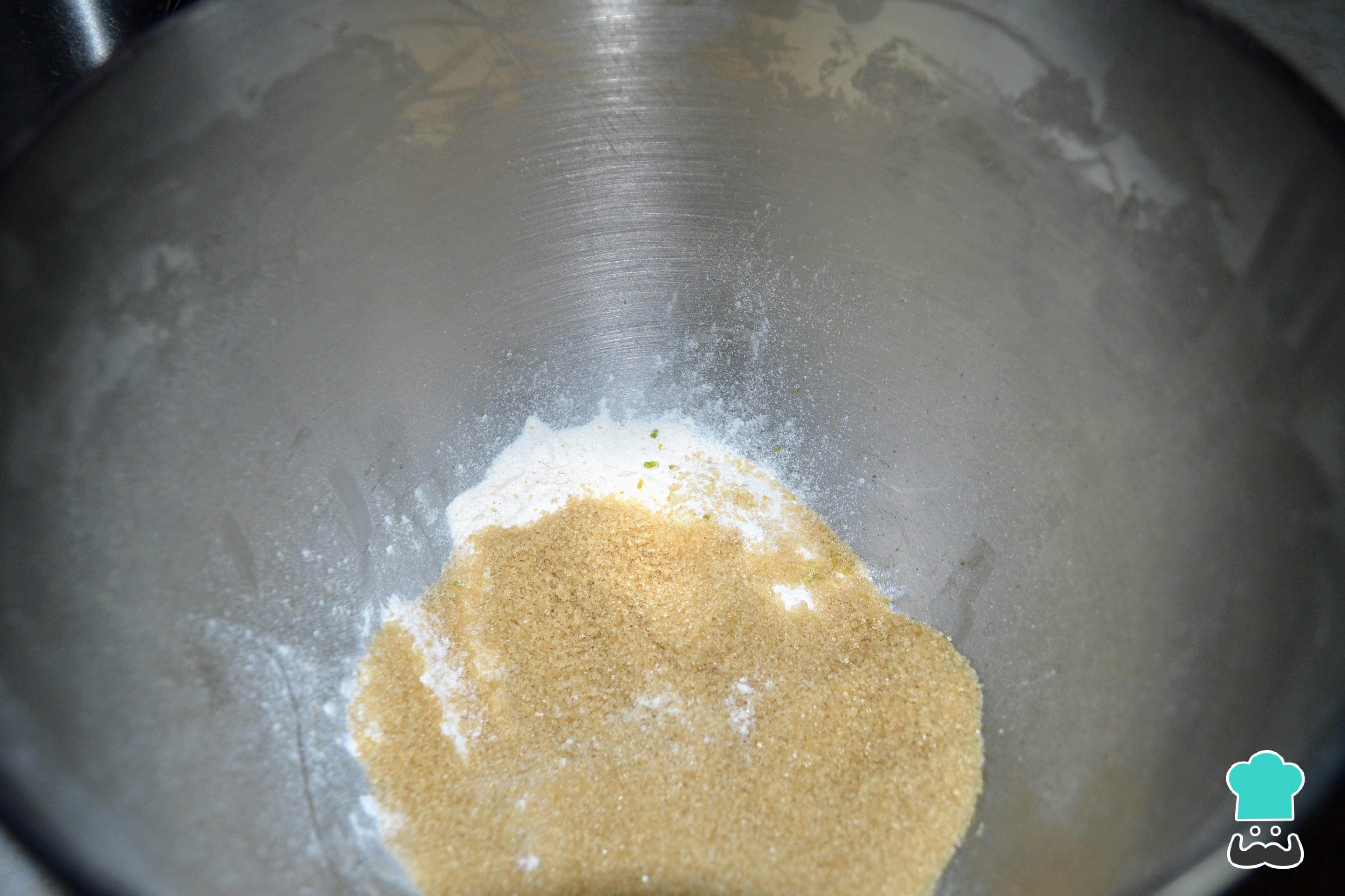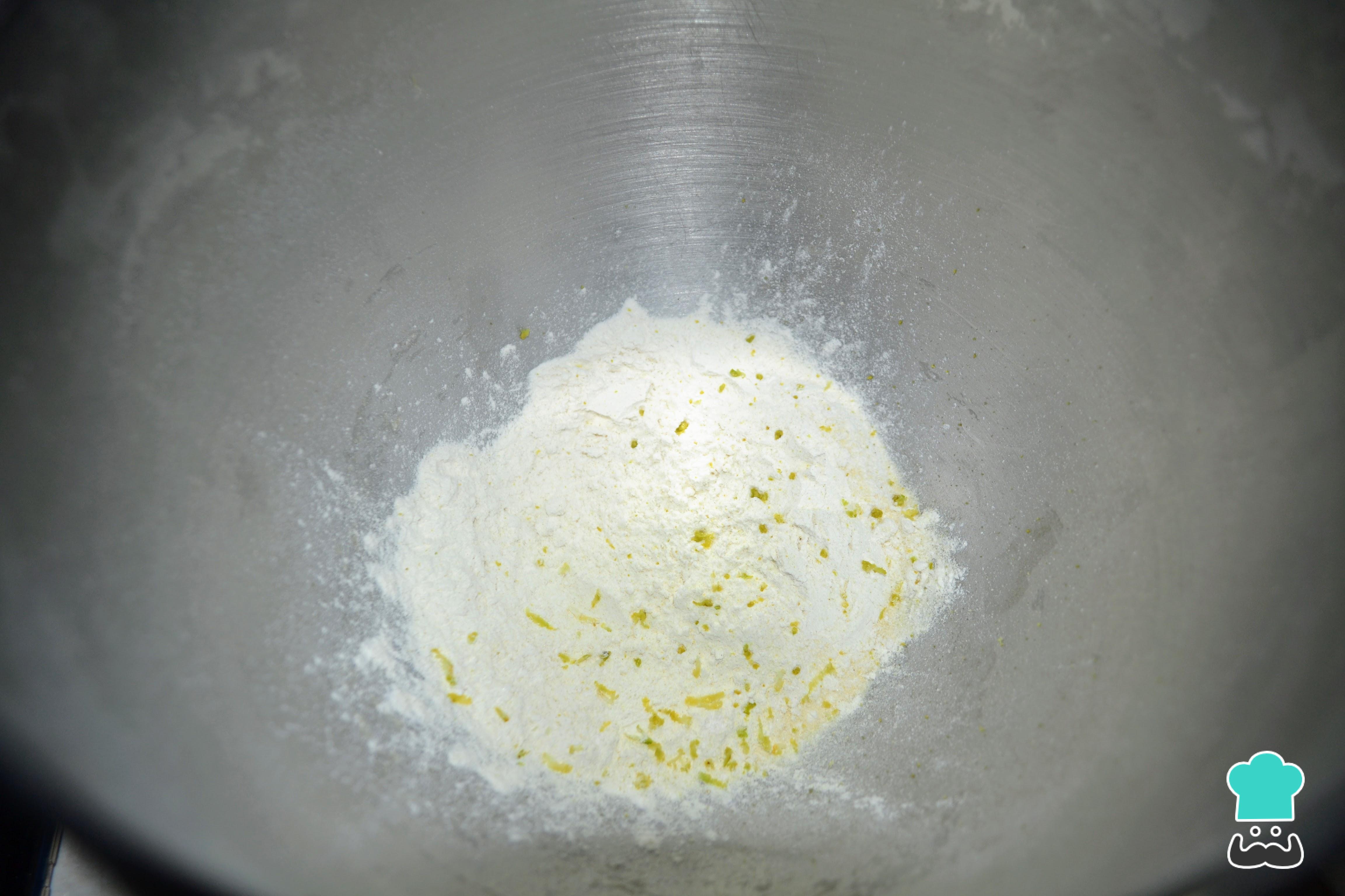 En el recipiente de la batidora, añade la harina previamente mezclada con la levadura y agrega la ralladura de naranja. Es importante que al momento de rallar la fruta no incluyas la parte blanca para evitar que la mezcla tenga un sabor amargo.