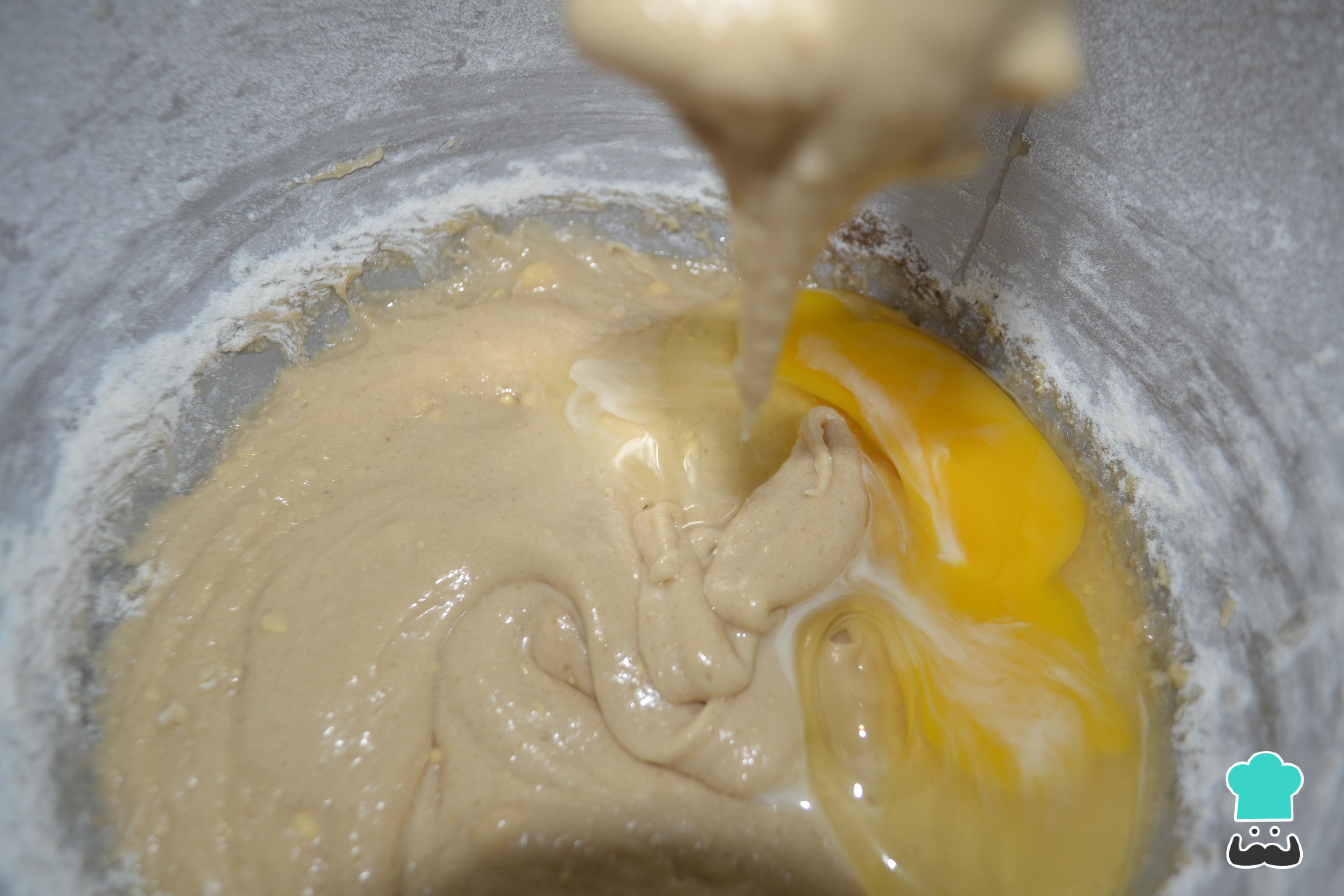 Añade el azúcar en forma de lluvia y bate con el gancho de la batidora.