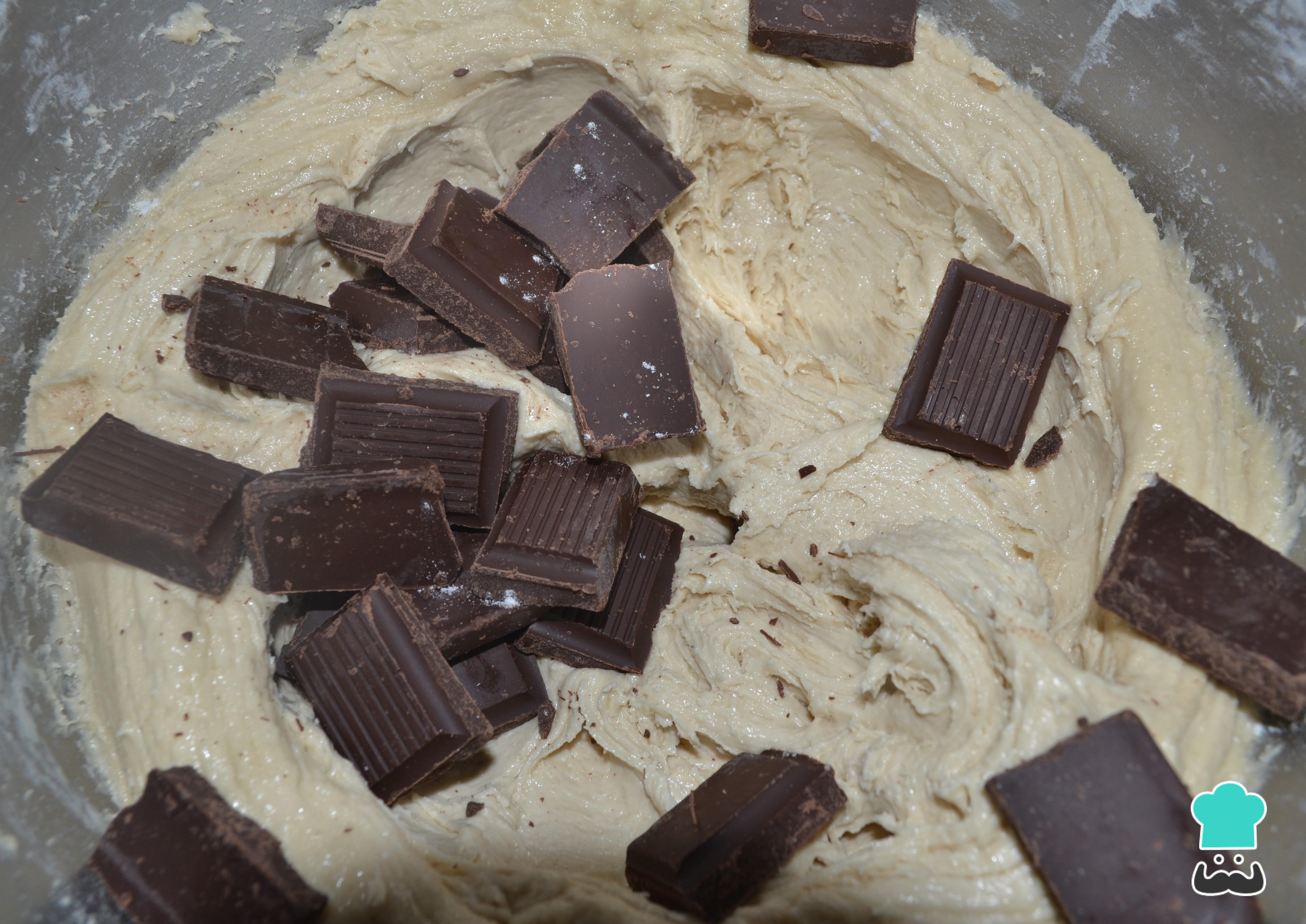 Añade el chocolate en chispas o en barras cortado en trozos medianos. También debes agregar las pasas al gusto. Si deseas conseguir un toque dulce, añade más pasas, y, si por el contrario, no te gusta este sabor, añade menos.