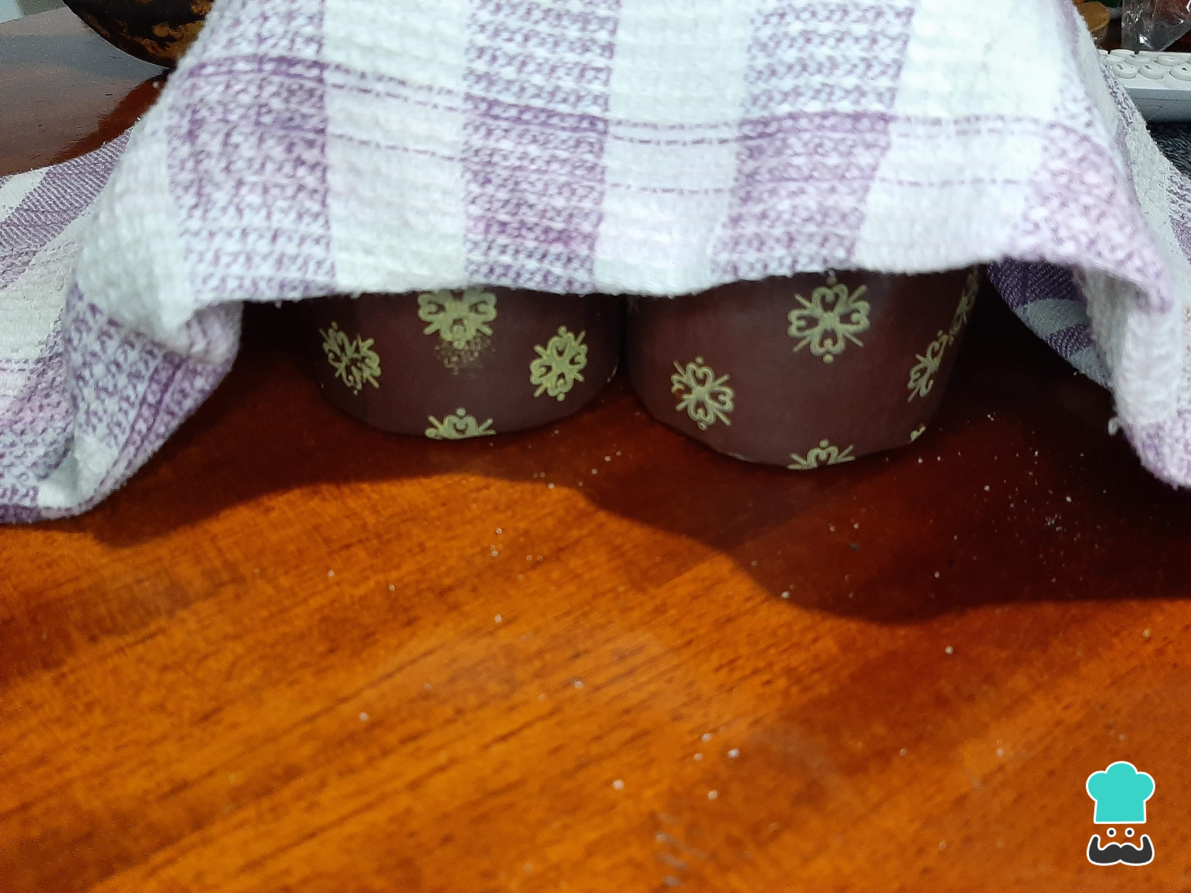 Tapa los panettone de chocolate y deja leudar aproximadamente 5-6 horas. En el caso que te encuentres en una zona de calor, puede tardar entre 3-4 horas, esto dependerá de la temperatura del ambiente. Precalienta el horno 15 minutos a 180 ºC. ¡Ya casi está el panettone de chocolate casero!