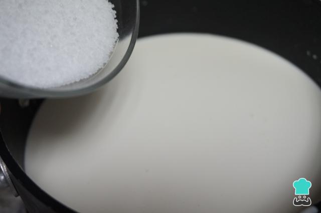 En un cazo añade la nata a calentar a fuego medio y, seguido, incorpora el azúcar. Mueve poco a poco para que se mezcle bien el azúcar y no se pegue. Deja hasta que esté caliente y a punto de hervir.