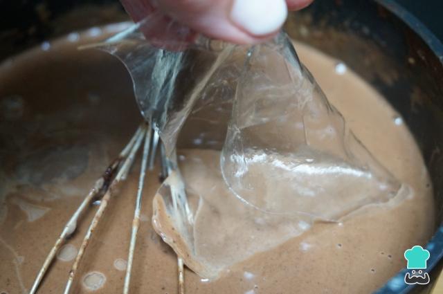 Cuando esté el chocolate bien mezclado, escurre bien las hojas de gelatina e introdúcelas una a una a la mezcla de chocolate caliente. Remueve para que se disuelvan bien, así hasta que estén todas las hojas.