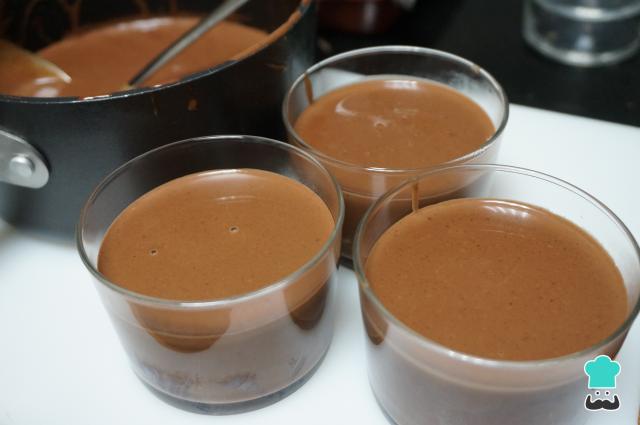 Incorpora la mezcla de chocolate en vasos para servir, flaneras o en copas. Seguido, unta con un poco de mantequilla o con aceite para que sea más fácil desmoldar. Deja que se enfríe la panna cotta y, después, introduce en la nevera unas 3-4 horas o de un día para otro.