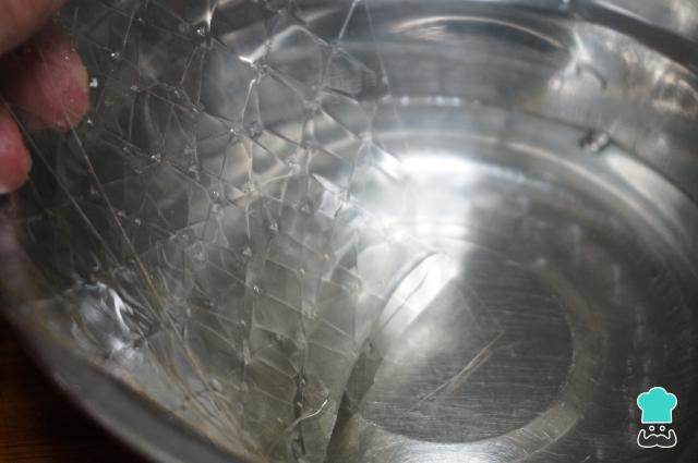 Prepara un bol ancho con agua, añade las hojas de gelatina en agua fría. Las tendremos el tiempo que nos indica el fabricante, unos 10 minutos.