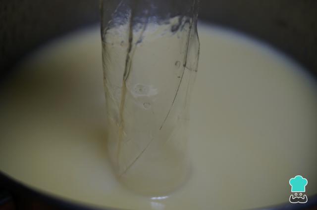 Escurrimos las hojas de gelatina bien, las añadimos poco apoco a la nata caliente, iremos removiendo hasta que se hayan disuelto bien.