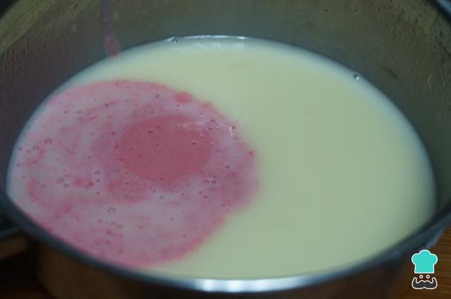 Luego, añadimos las fresas que tenemos trituradas, vamos agregándolas poco a poco y mezclando muy bien.