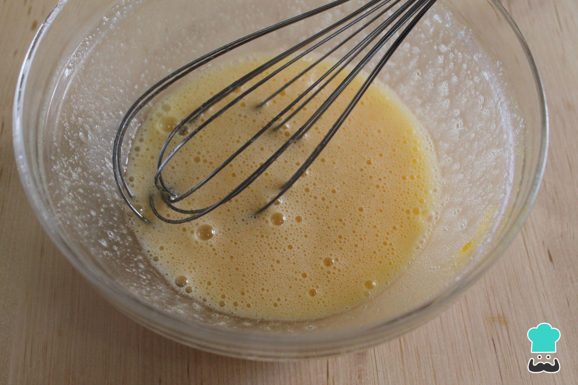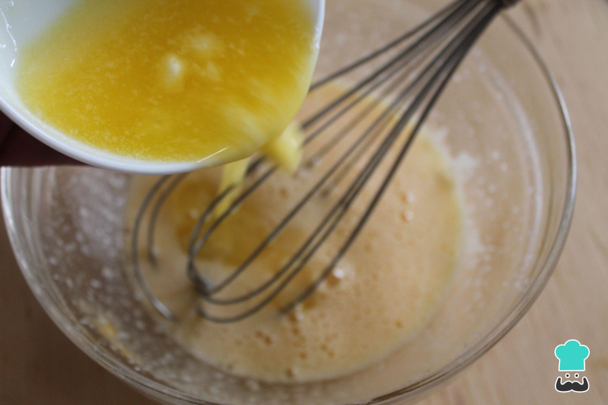 Seguidamente, trocea la mantequilla y funde a baja potencia en el microondas. Incorpora a la mezcla de huevos y azúcar y bate de nuevo hasta que esté bien incorporada.