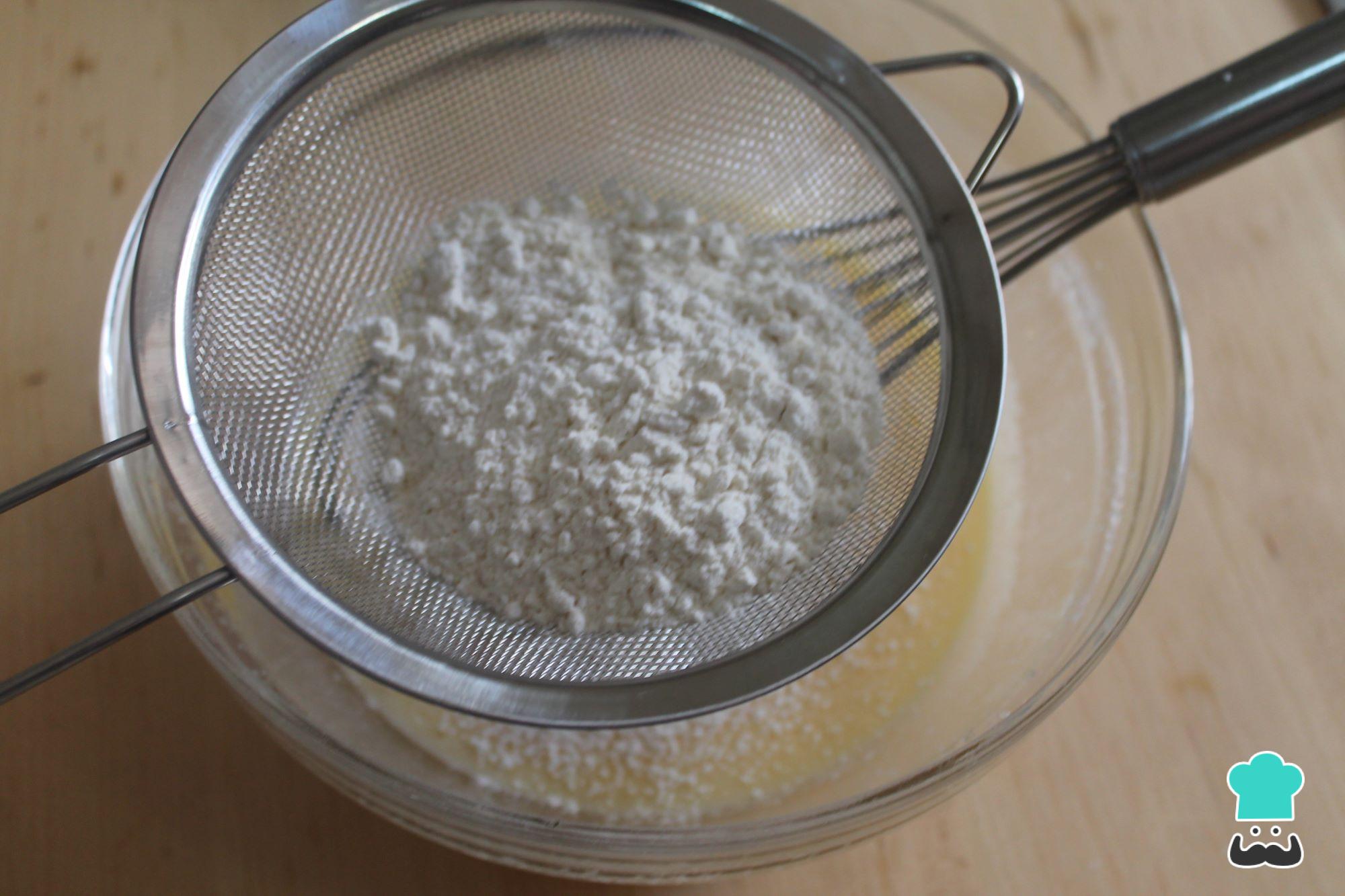A continuación, mezcla la harina junto con la levadura y la pizca de sal y tamiza encima de la mezcla de huevos, azúcar y mantequilla. No la añadas toda, en primer lugar, añade solo la mitad de la harina.