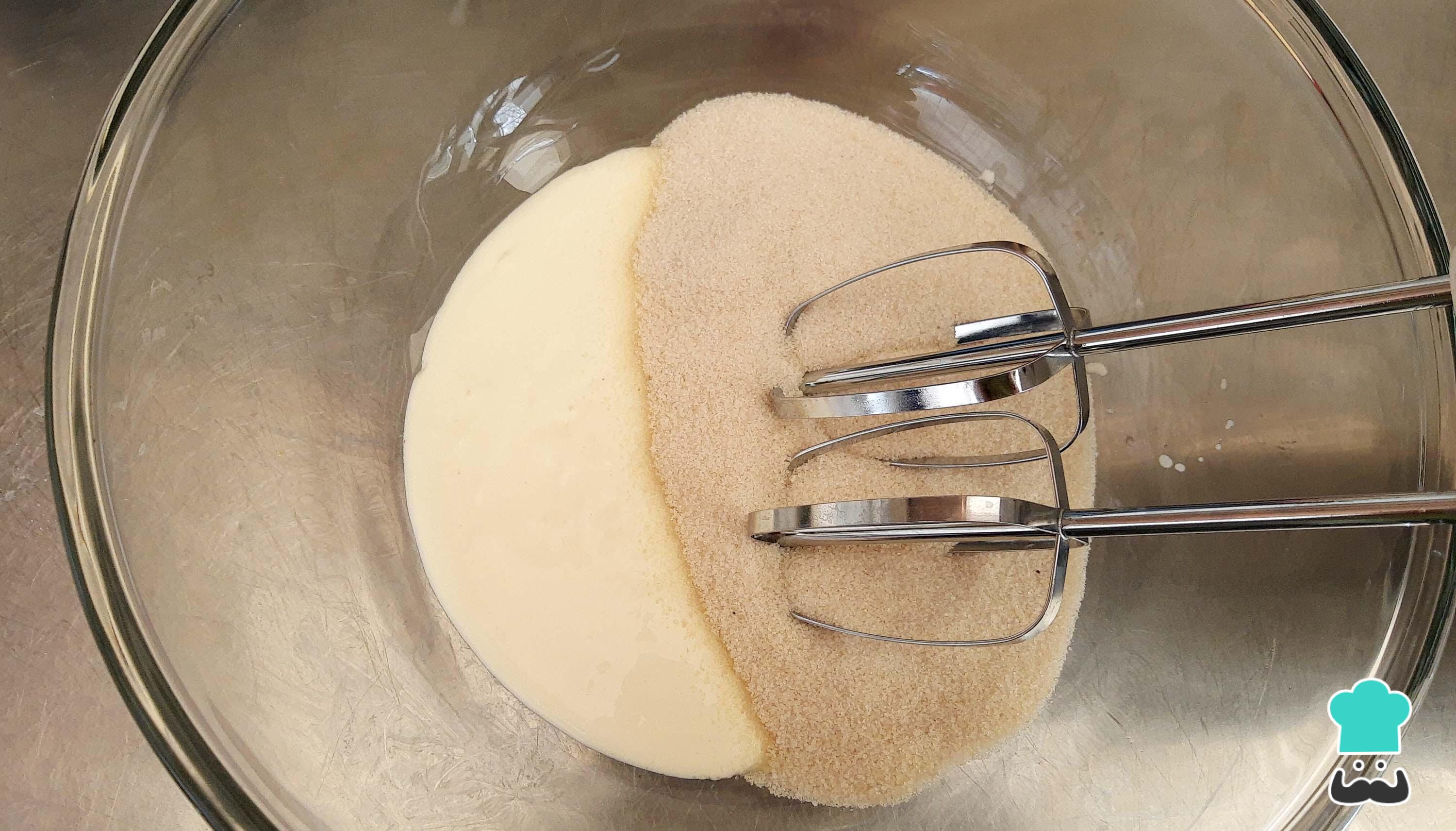 Comienza la receta del panque de nata batiendo la nata con el azúcar, bate por al menos 3 minutos. Puedes usar nata con azúcar o natural. Si utilizas nata con azúcar, reduce a la mitad la cantidad de azúcar granulada.