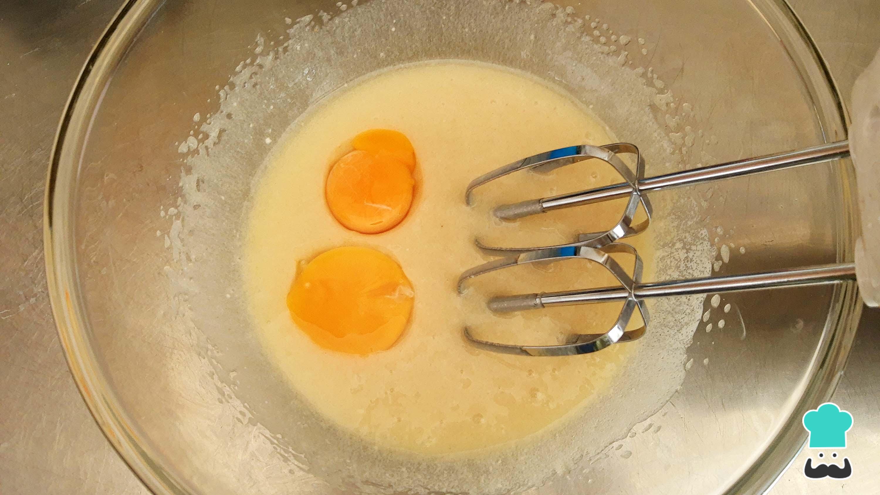 Luego, separa las yemas de las claras y agrégalas a la mezcla, bate por 2 minutos.
