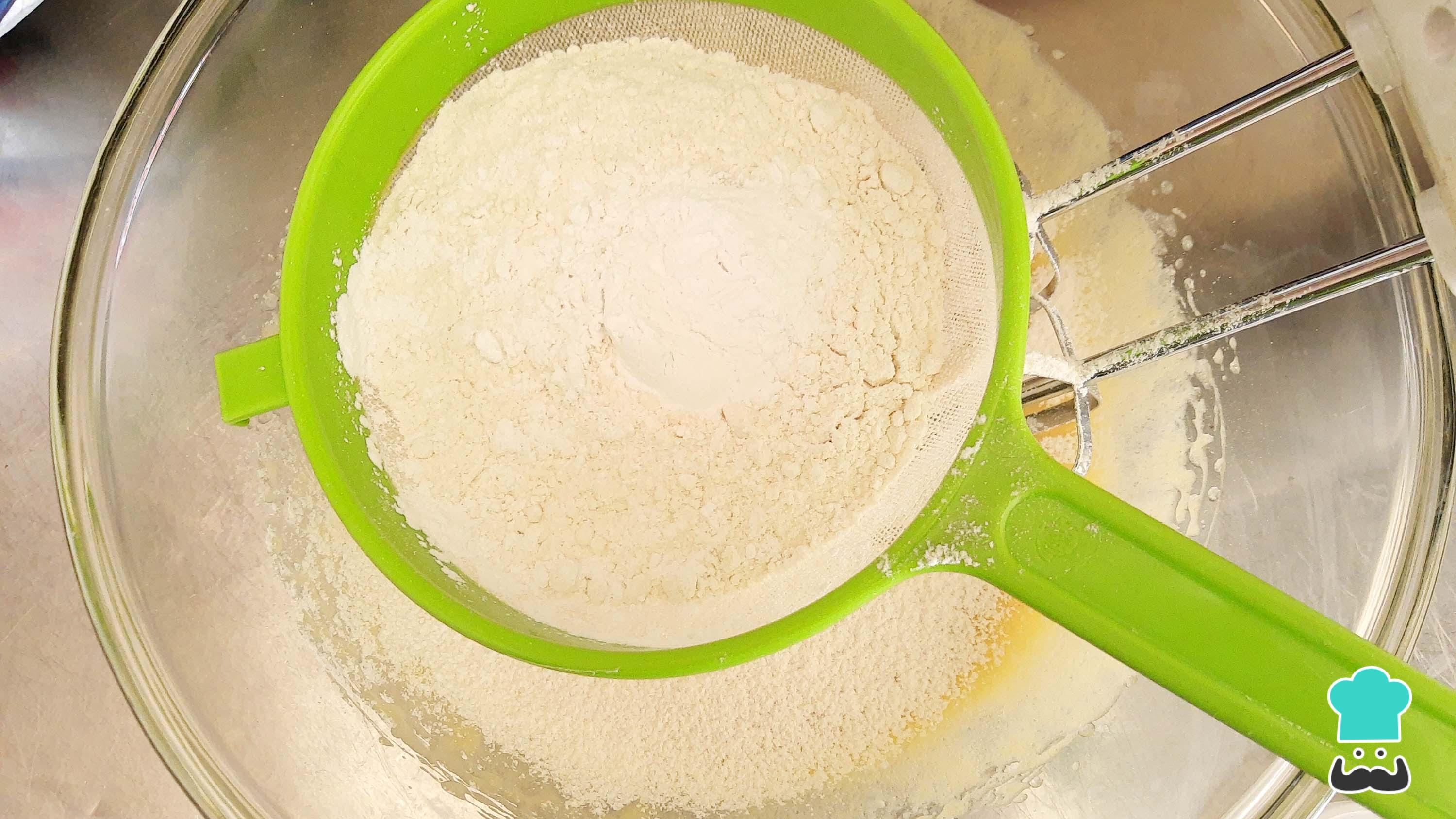 Con un ayuda de un colador, tamiza la harina, el polvo para hornear y la pizca de sal. Mezcla hasta integrar todo.