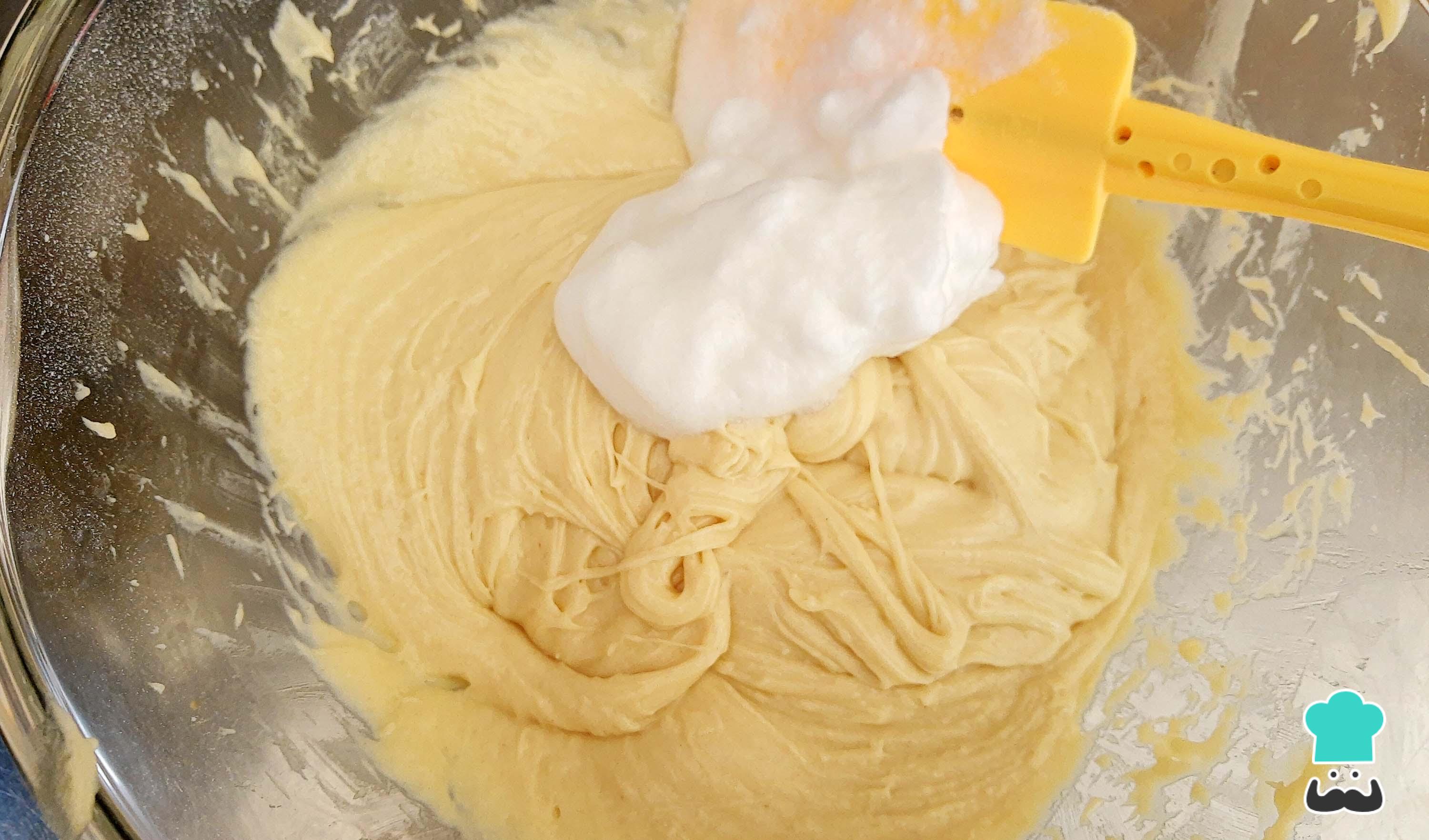 Truco: montando las claras añadirás aire y obtendrás un panqué de nata más esponjoso.