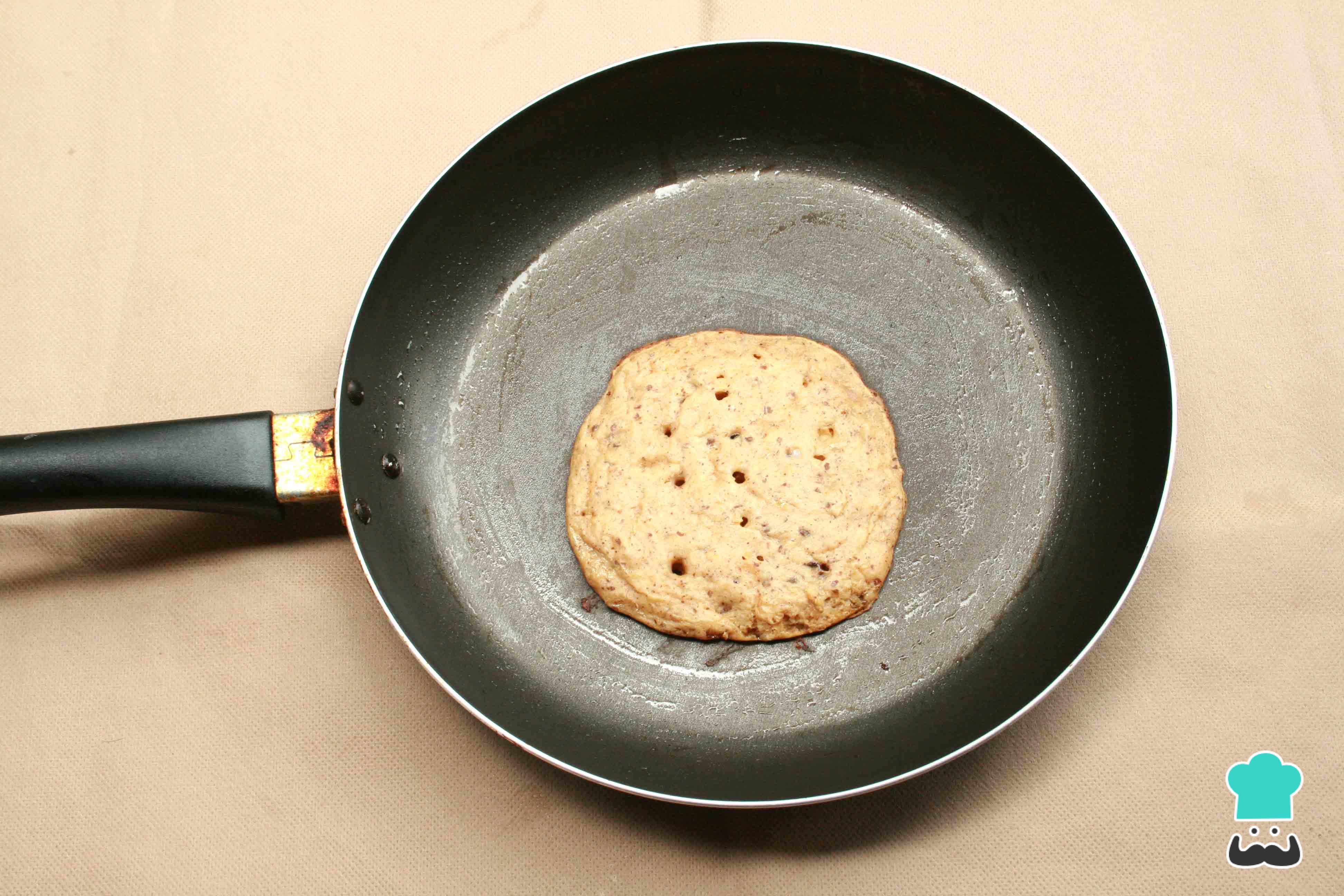 Pre-calienta una sartén preferiblemente anti-adherente y desliza por la superficie un papel impregnado con aceite. Aplica fuego medio-alto. Agrega con un cucharon de sopa, una porción de la masa de tortitas sin gluten. Sabrás el momento adecuado para voltear la panqueca cuando veas surgir burbujas.