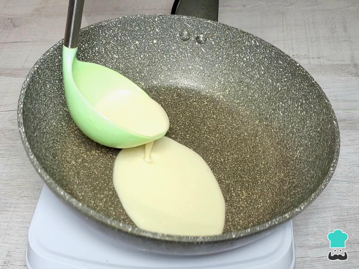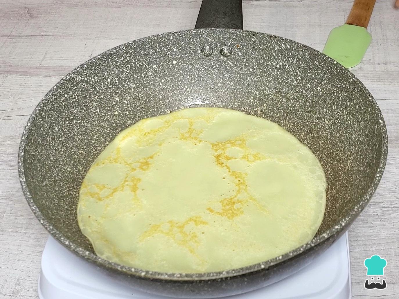 Coloca la sartén a fuego medio-bajo y, una vez caliente, enmantequilla ligeramente la superficie. Vierte un cucharón de la masa y, mientras viertes, gira la sartén para que la mezcla se distribuya uniformemente por toda la superficie. Deja cocinar por 2-3 minutos hasta que los bordes estén ligeramente dorados y la superficie se vea mate.