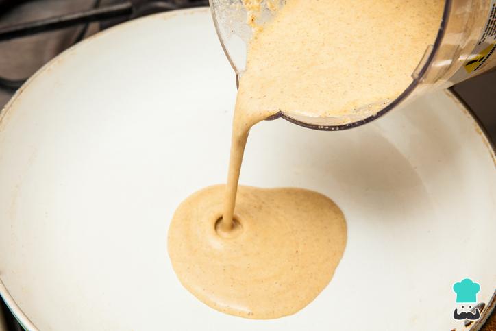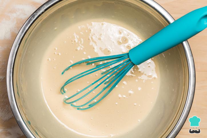 En un bol o en la licuadora, mezcla los huevos, la harina, la leche y el azúcar hasta que quede una masa semi espesa y sin grumos. Si queda muy líquida o muy espesa, añade harina o leche respectivamente.