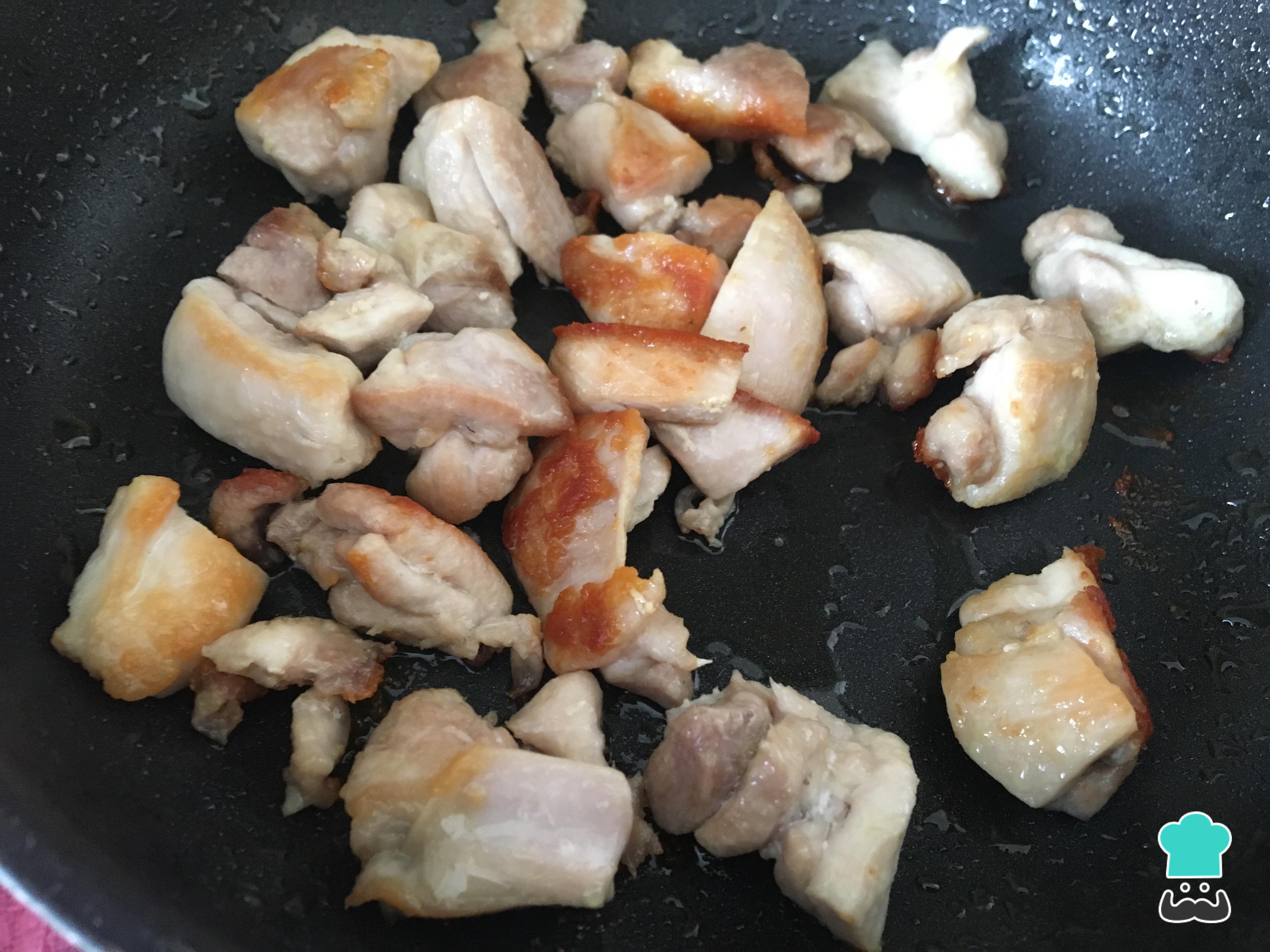 Pica el pollo en pedacitos y condiméntalo con sal y pimienta. Ponlo a cocinar en una sartén hasta que quede sellado. Retira y reserva.
