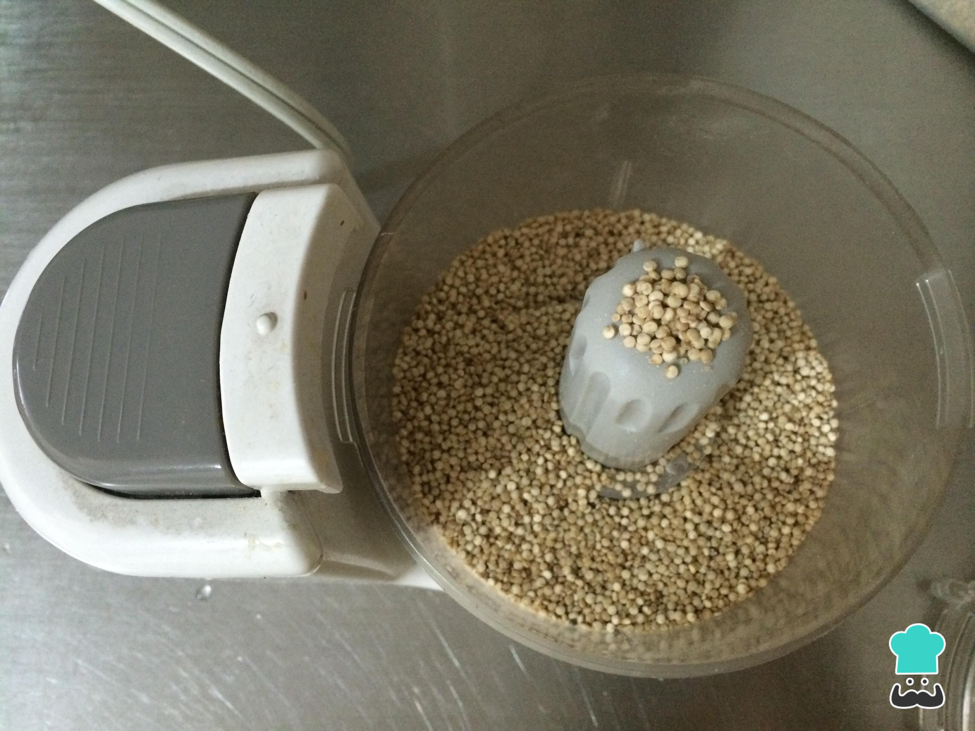 En un procesador o licuadora, añadir la quinoa y procesar hasta obtener una harina homogénea. Eso sí, antes deberás lavar bien la quinoa, cubriéndola con agua, escurriéndola y repitiendo el proceso hasta que el agua salga transparente. Este paso es importante, no solo para deshacernos de las impurezas, sino para limpiar la quinoa de la saponina que la compone, perjudicial para nuestro organismo. Si quieres puedes usar directamente harina de quinoa.