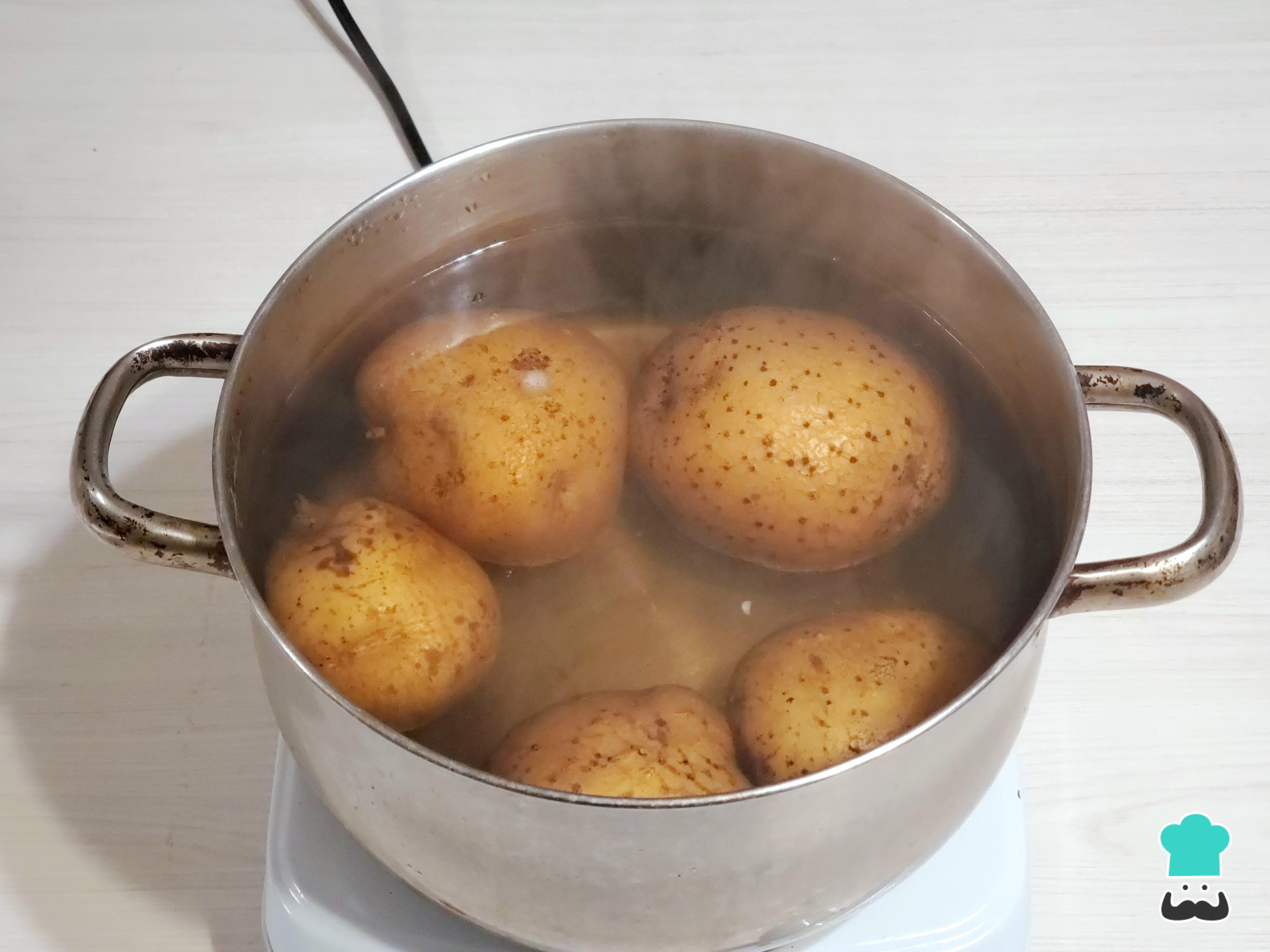 Comienza con la preparación de la papa rellena peruana sancochando las papas bien lavadas en abundante agua fría para hacer la masa. Cocina a fuego medio-bajo durante unos 30 a 40 minutos, o hasta que puedas pincharlas con un palillo o la punta de un cuchillo y penetren fácilmente.