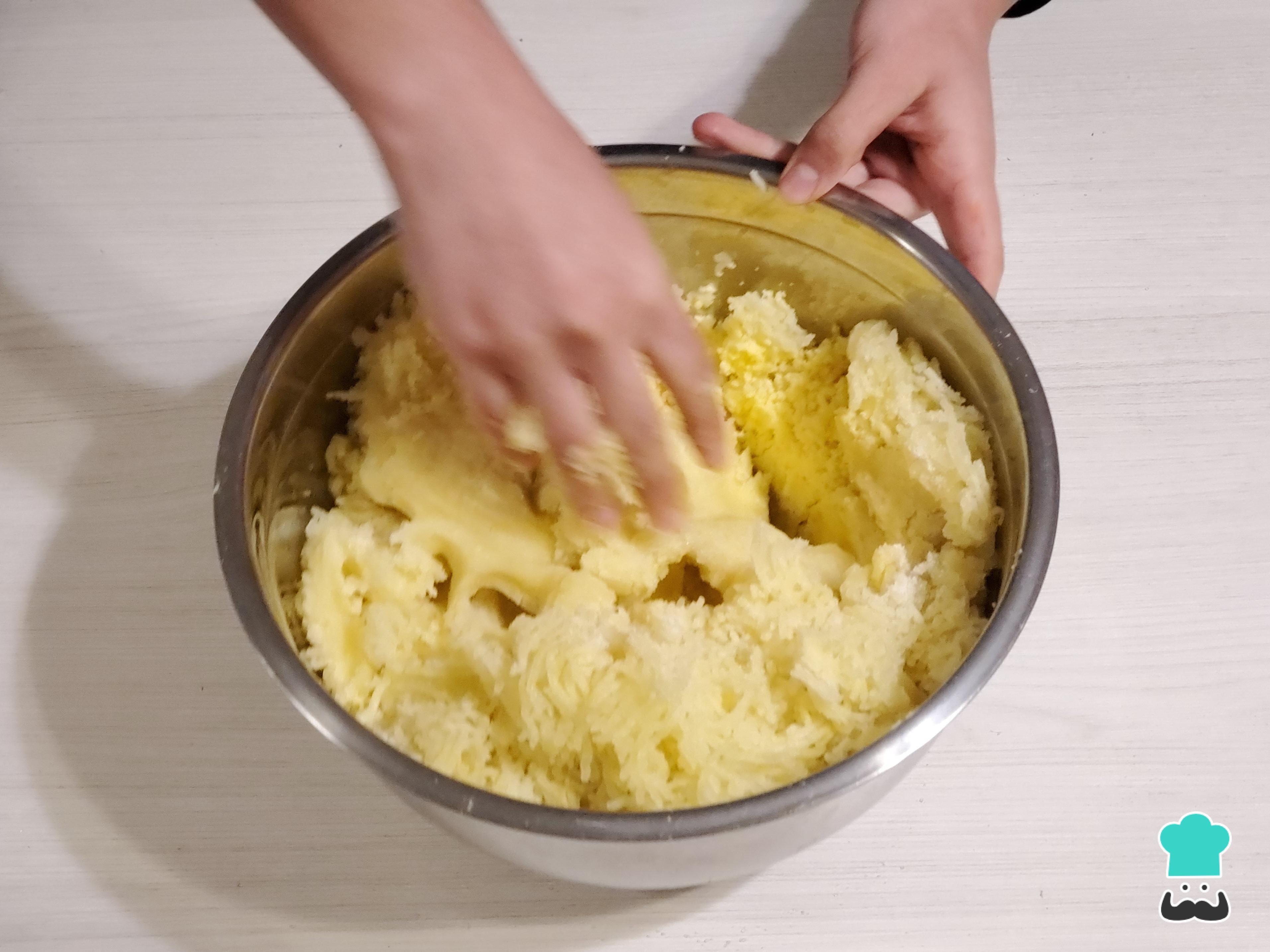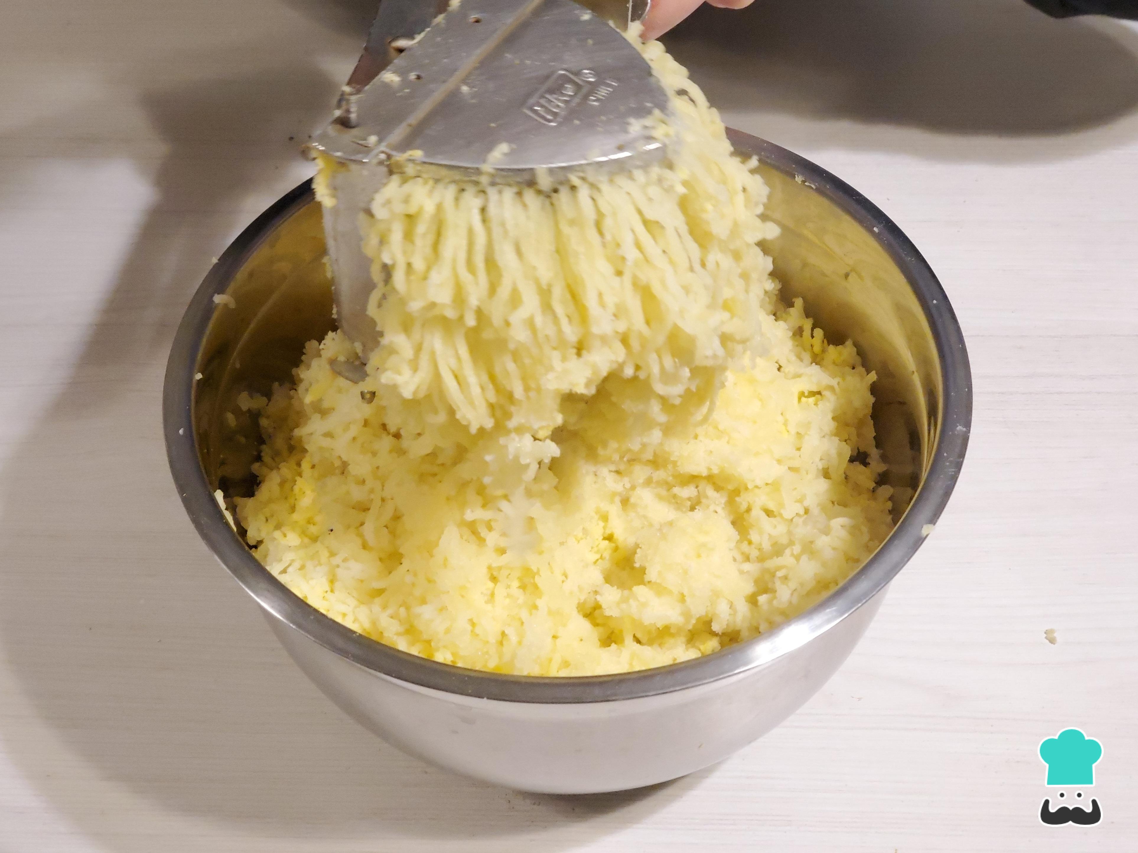 Una vez fría la masa de papa, agrega sal al gusto y una pizca de pimienta blanca recién molida, amasa bien y reserva.