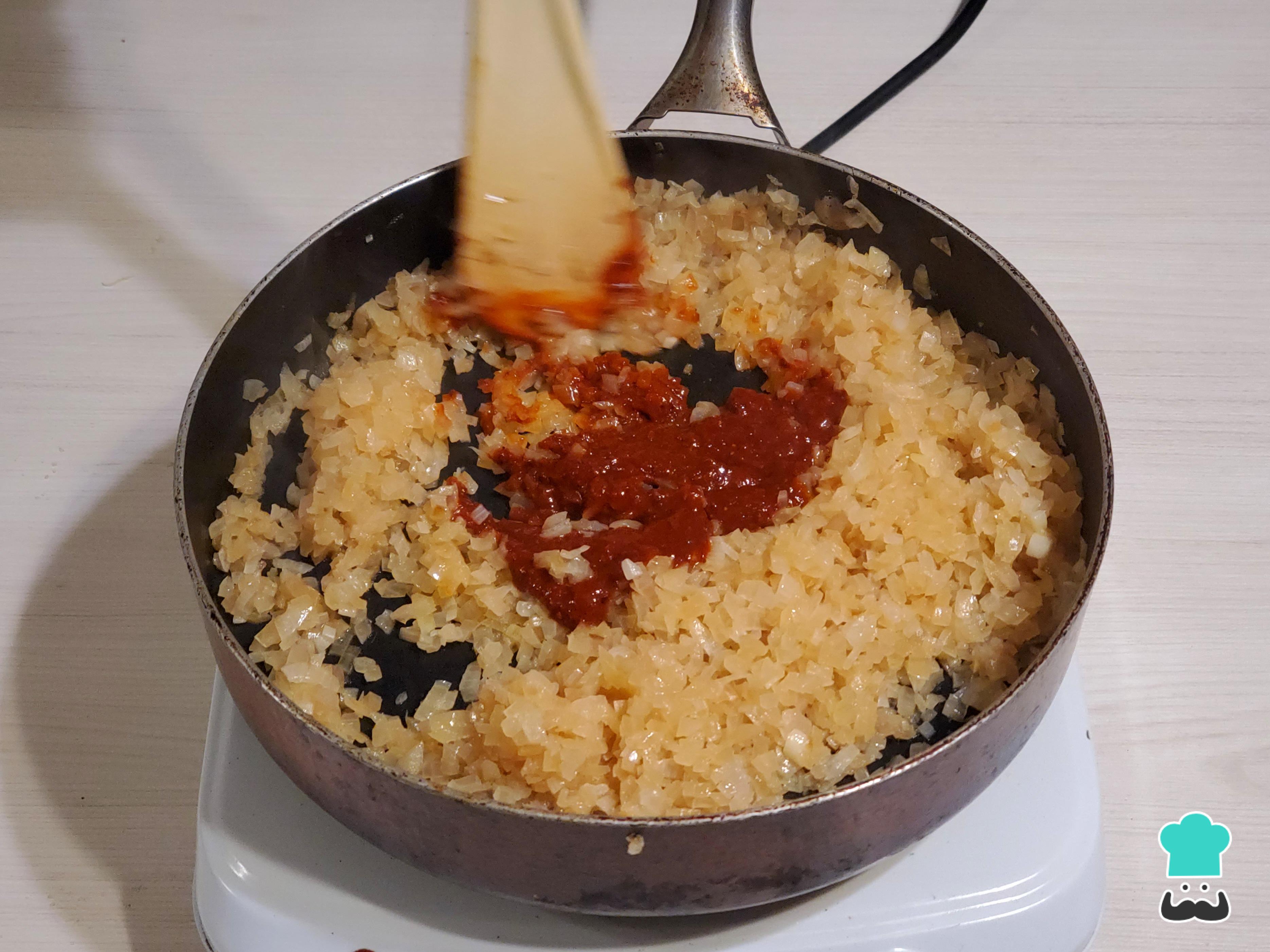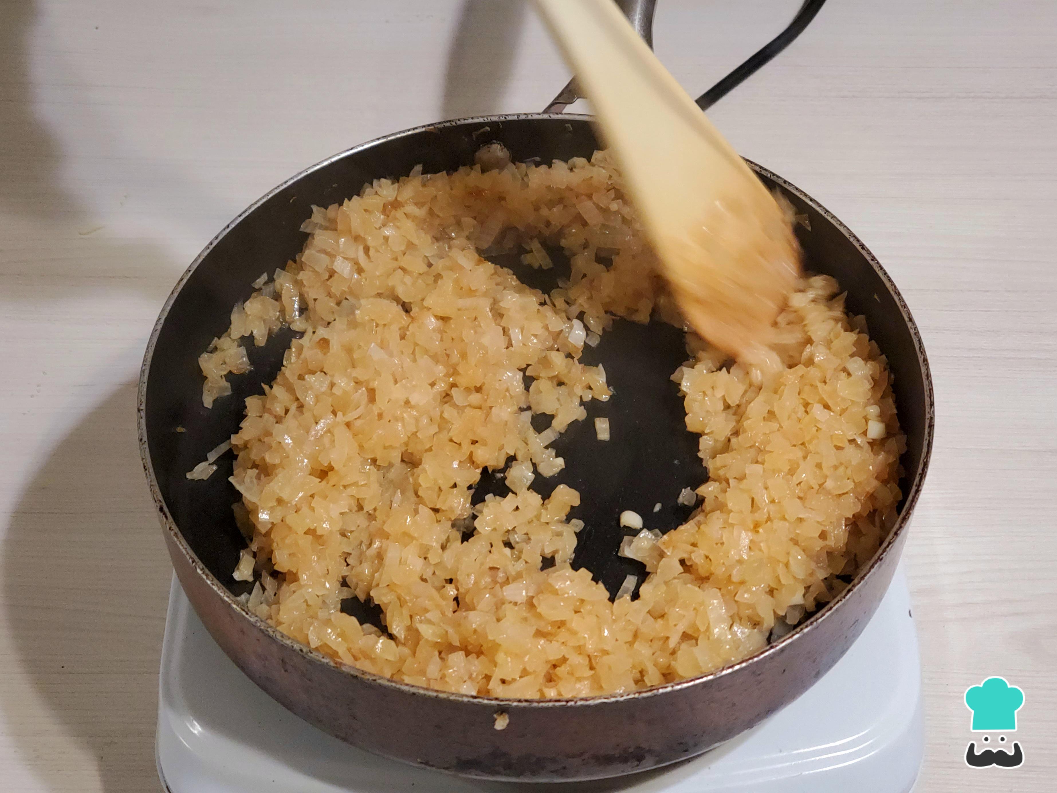 Aparte, en una sartén profunda, vierte un buen chorro de aceite. Cuando esté caliente, vuelca la cebolla picada finamente y sofríe hasta que esté dorada. Incorpora el ajo y sofríe por un par de minutos más.