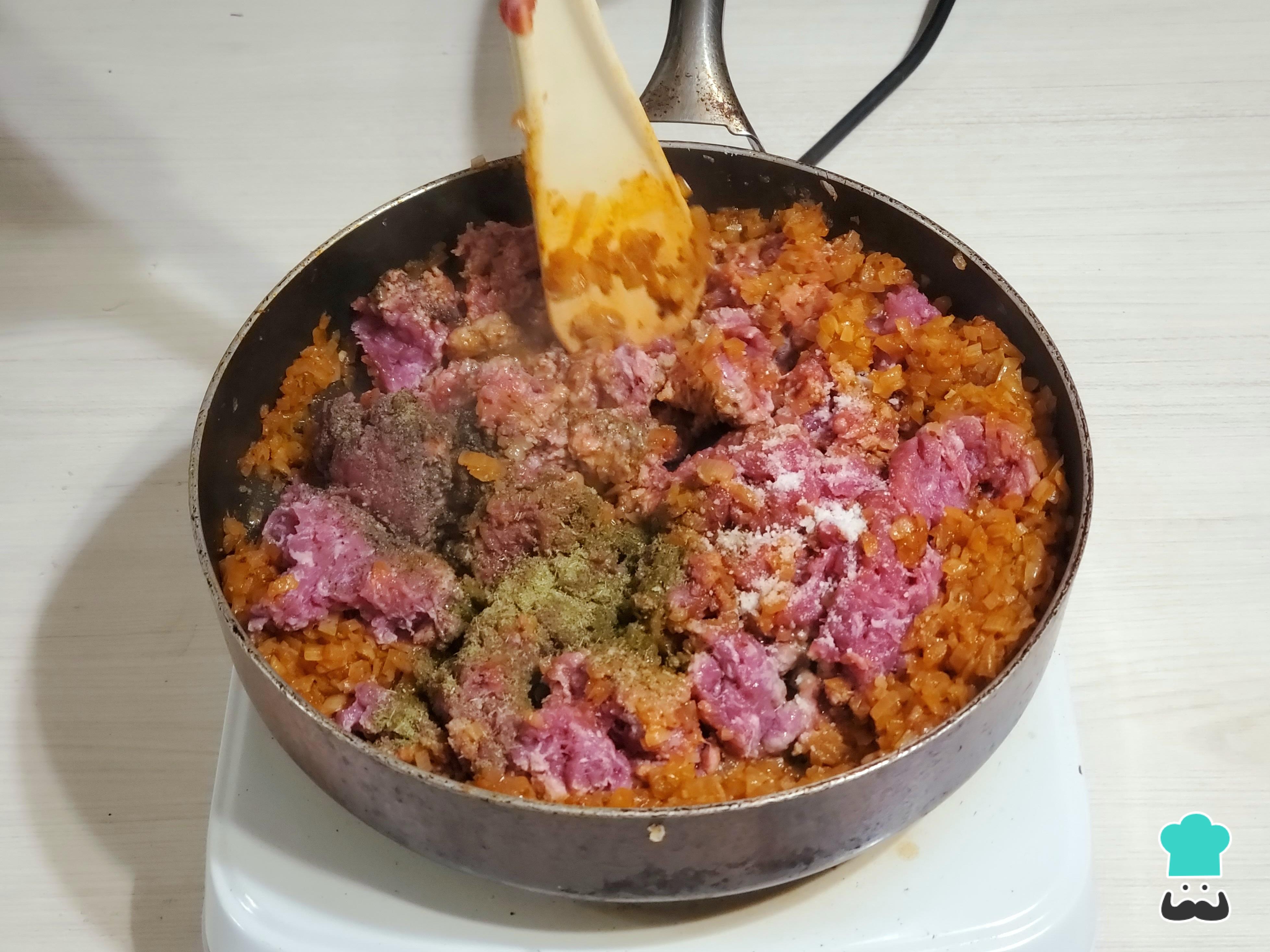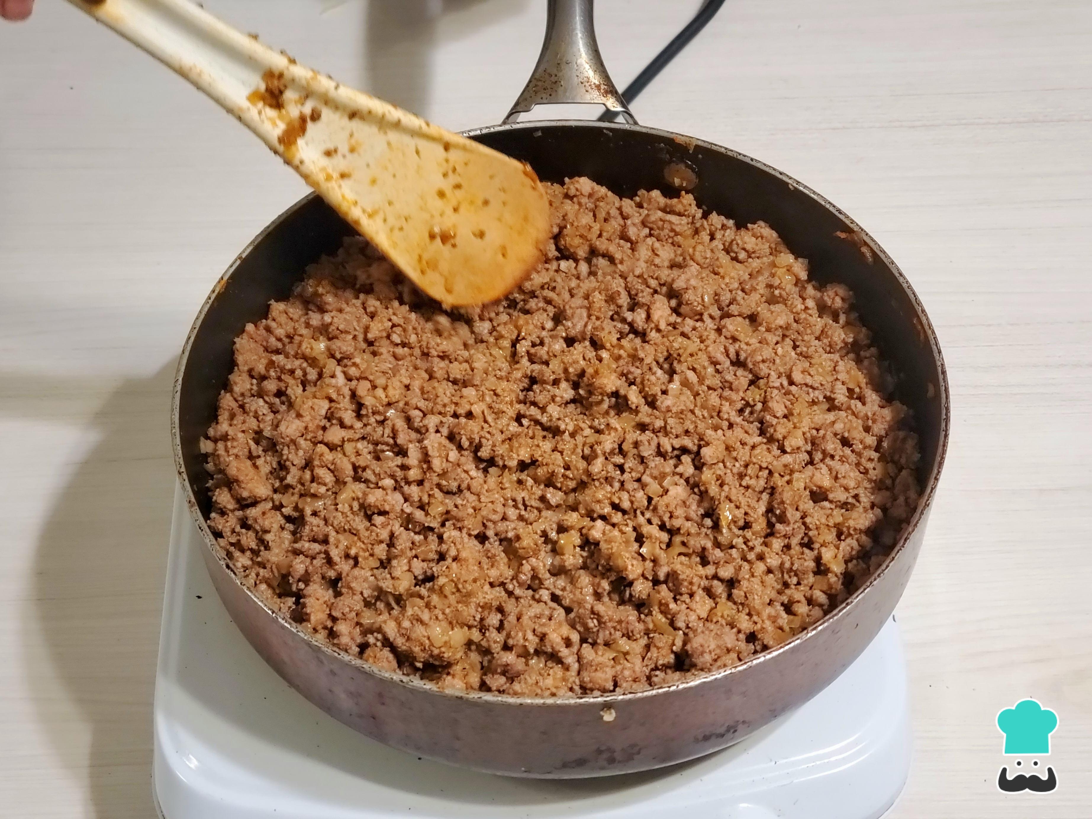 Con el aderezo listo, incorpora la carne picada o molida, remueve bien y deja que se cocine por unos 10 minutos aproximadamente o hasta que esté perfectamente cocida. En este momento puedes sazonar con pimienta, comino, orégano y sal al gusto.