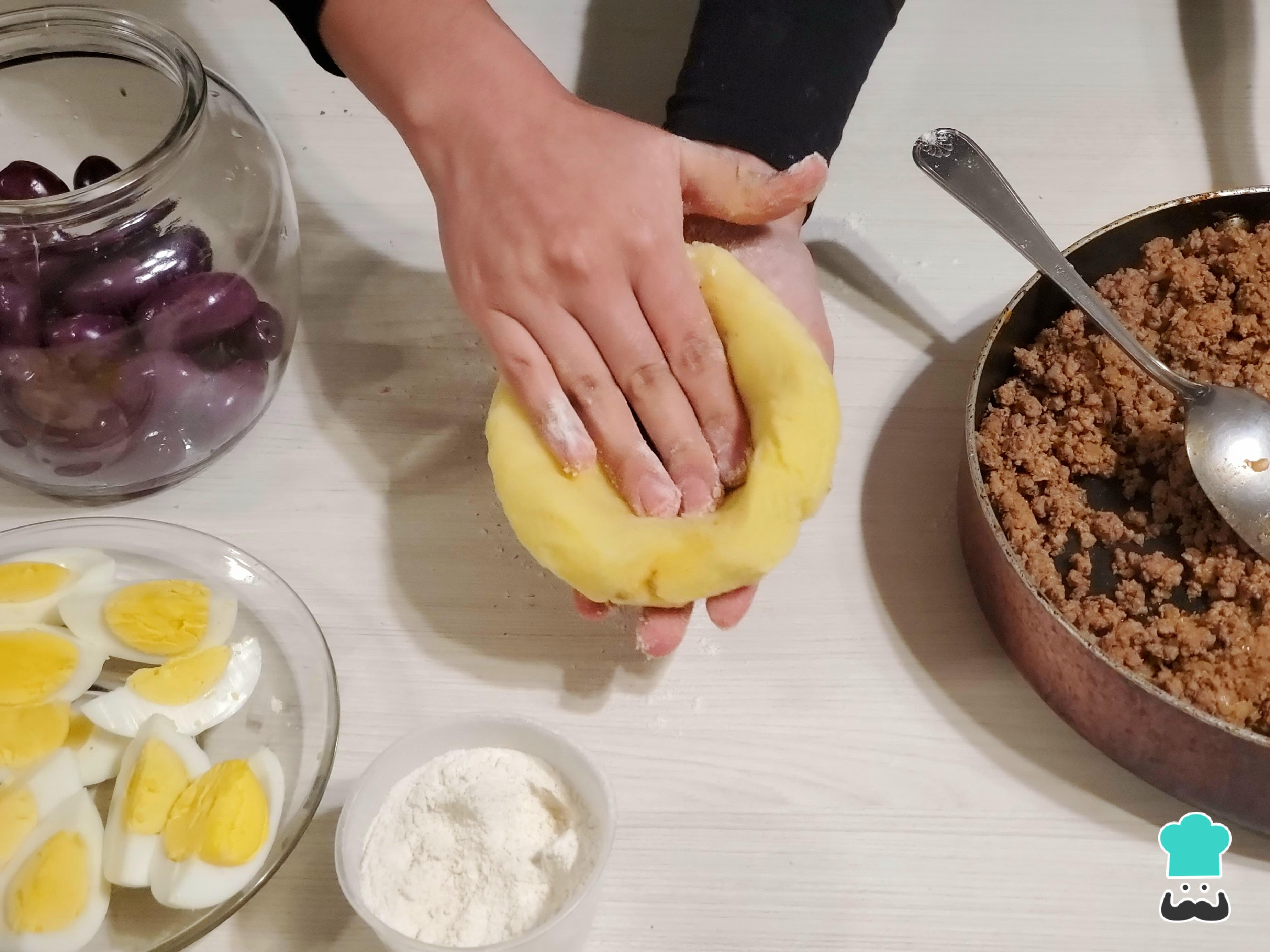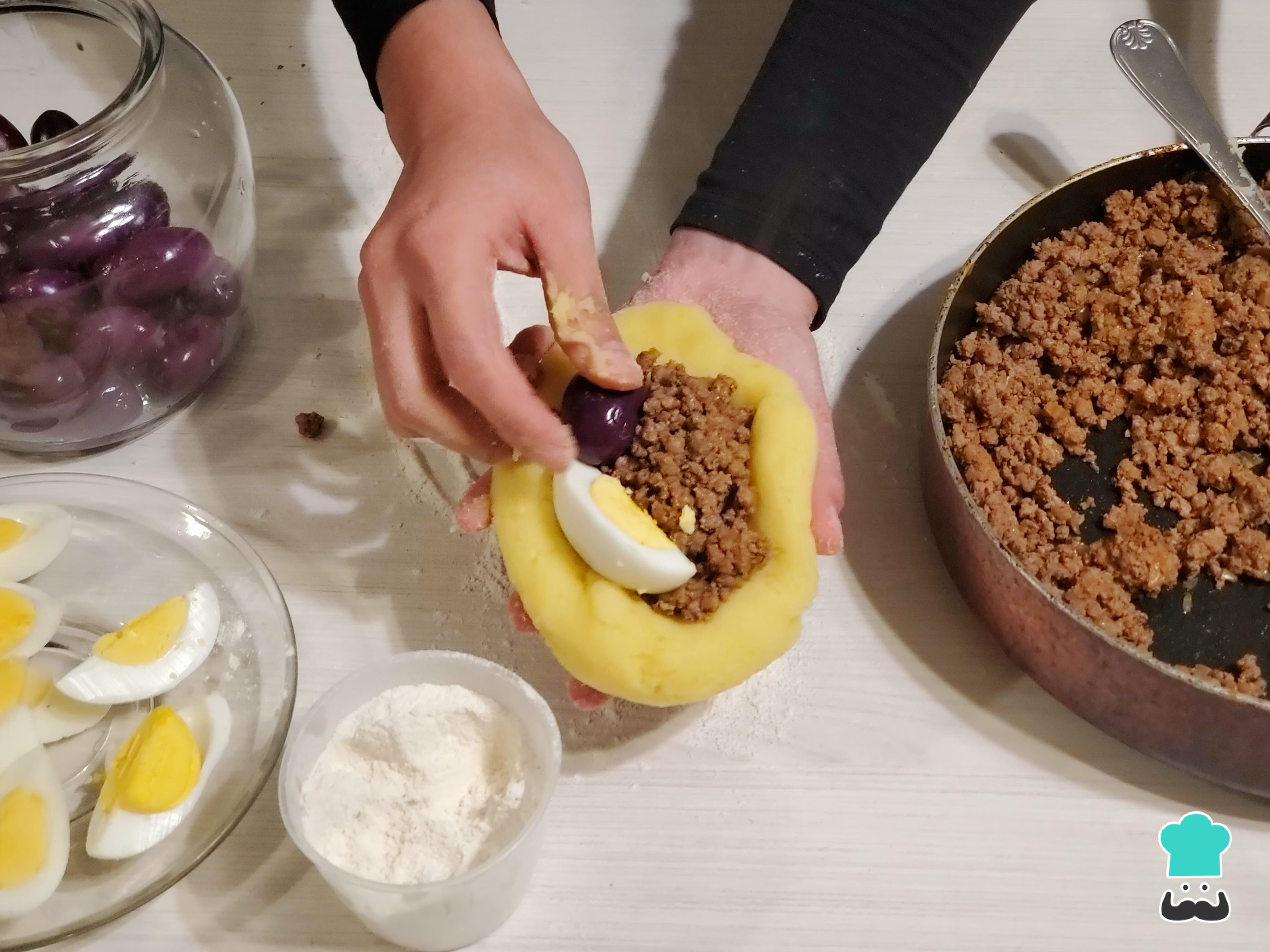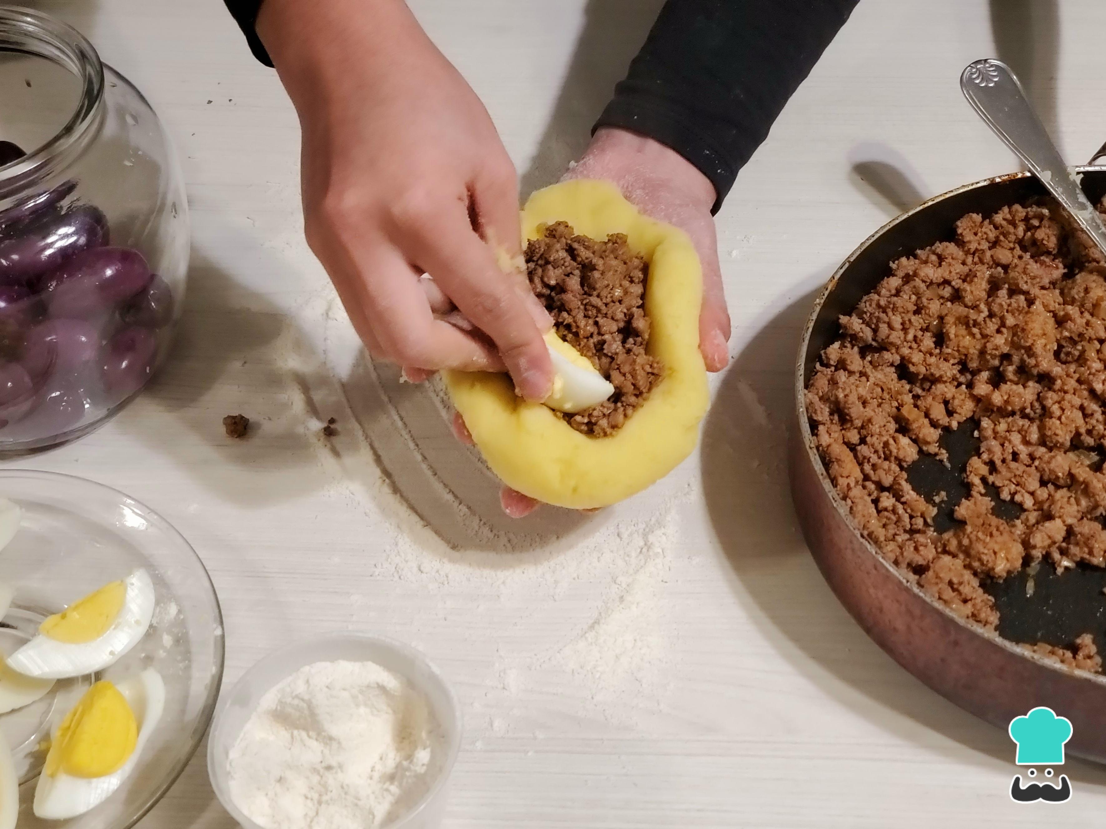 Coloca el relleno de carne en el centro y añade una aceituna y 1/4 de huevo sancochado. Cierra la masa cuidadosamente, cubriendo bien el relleno, proporciona forma ovalada con las manos.