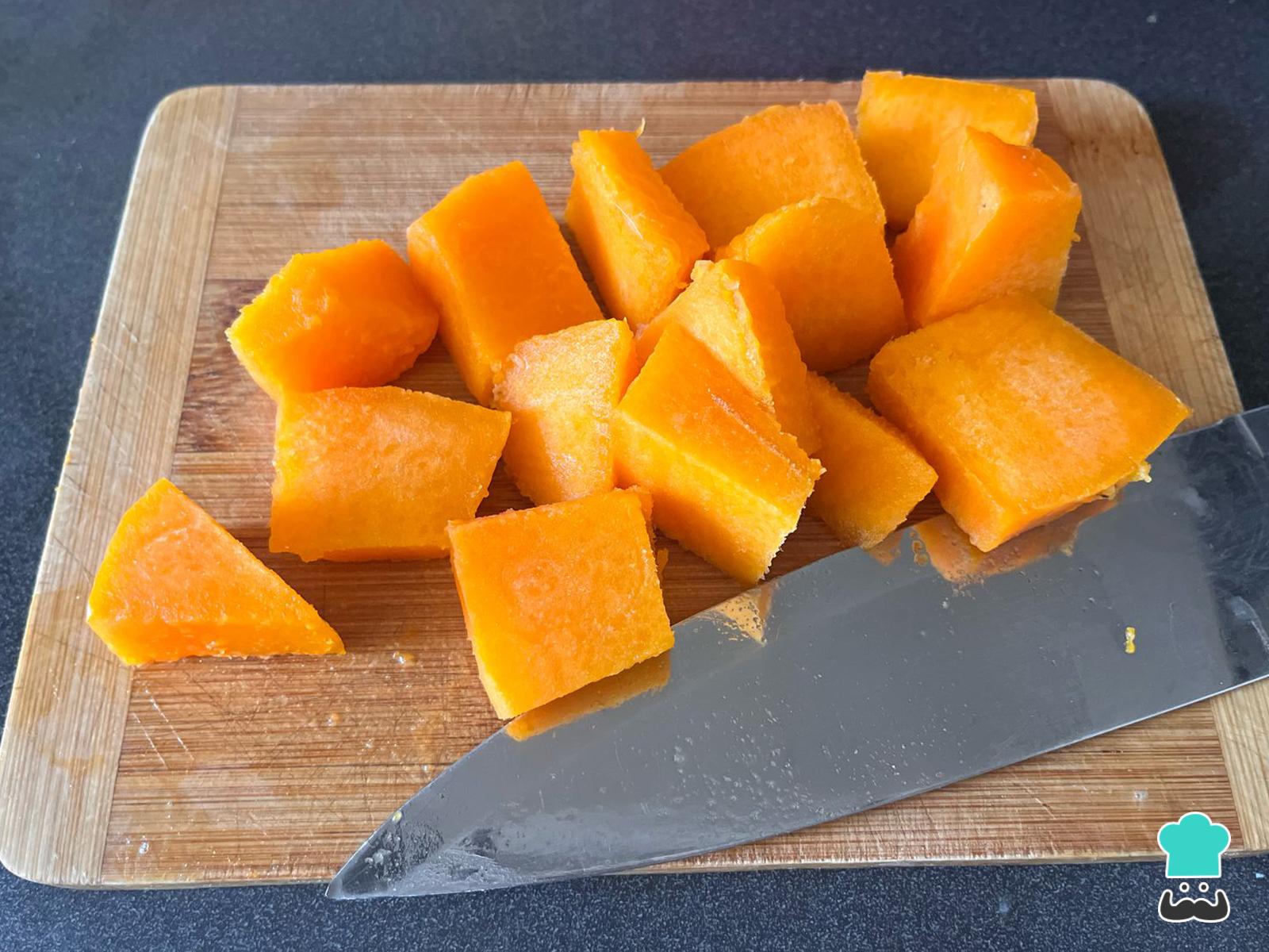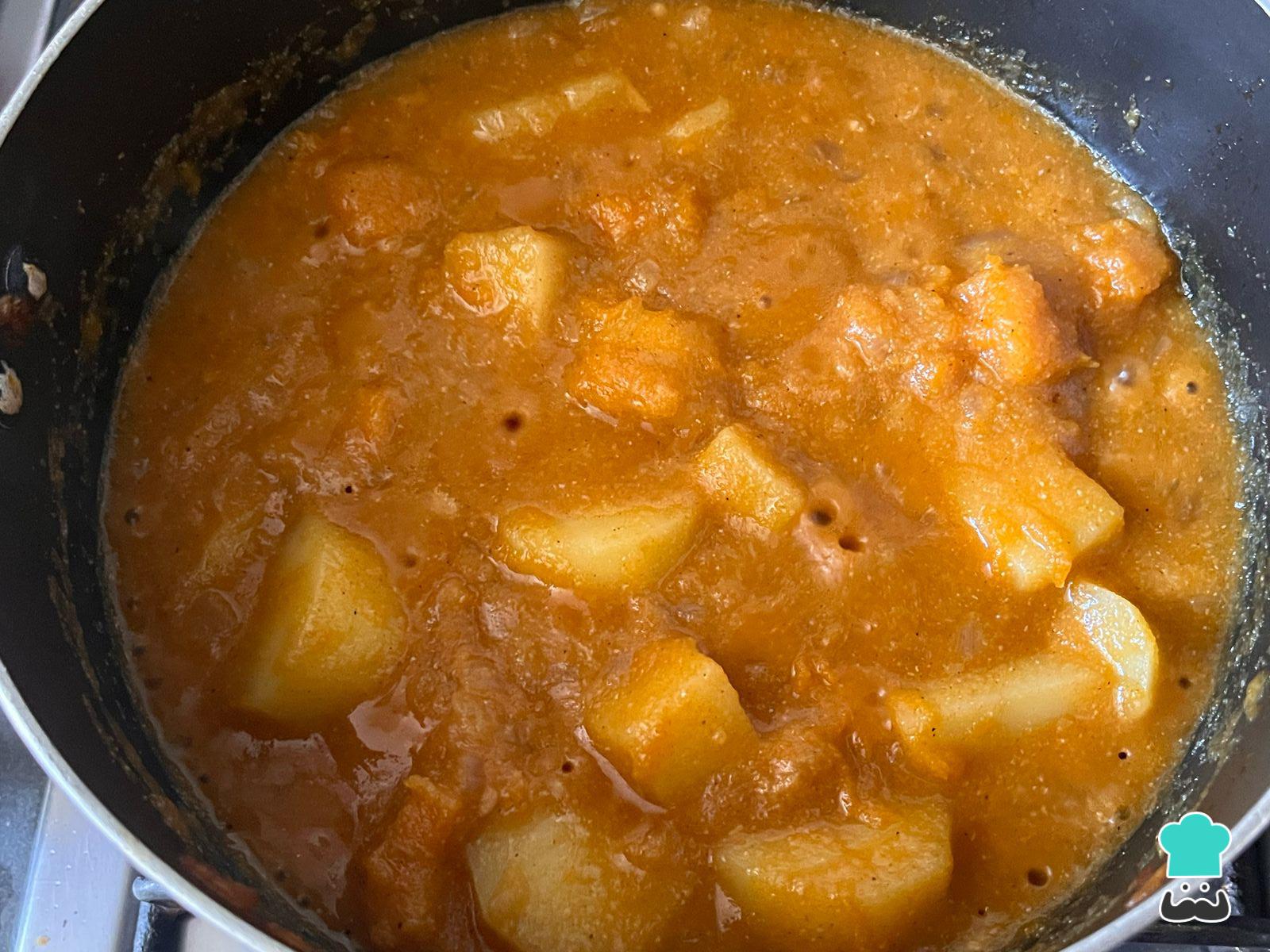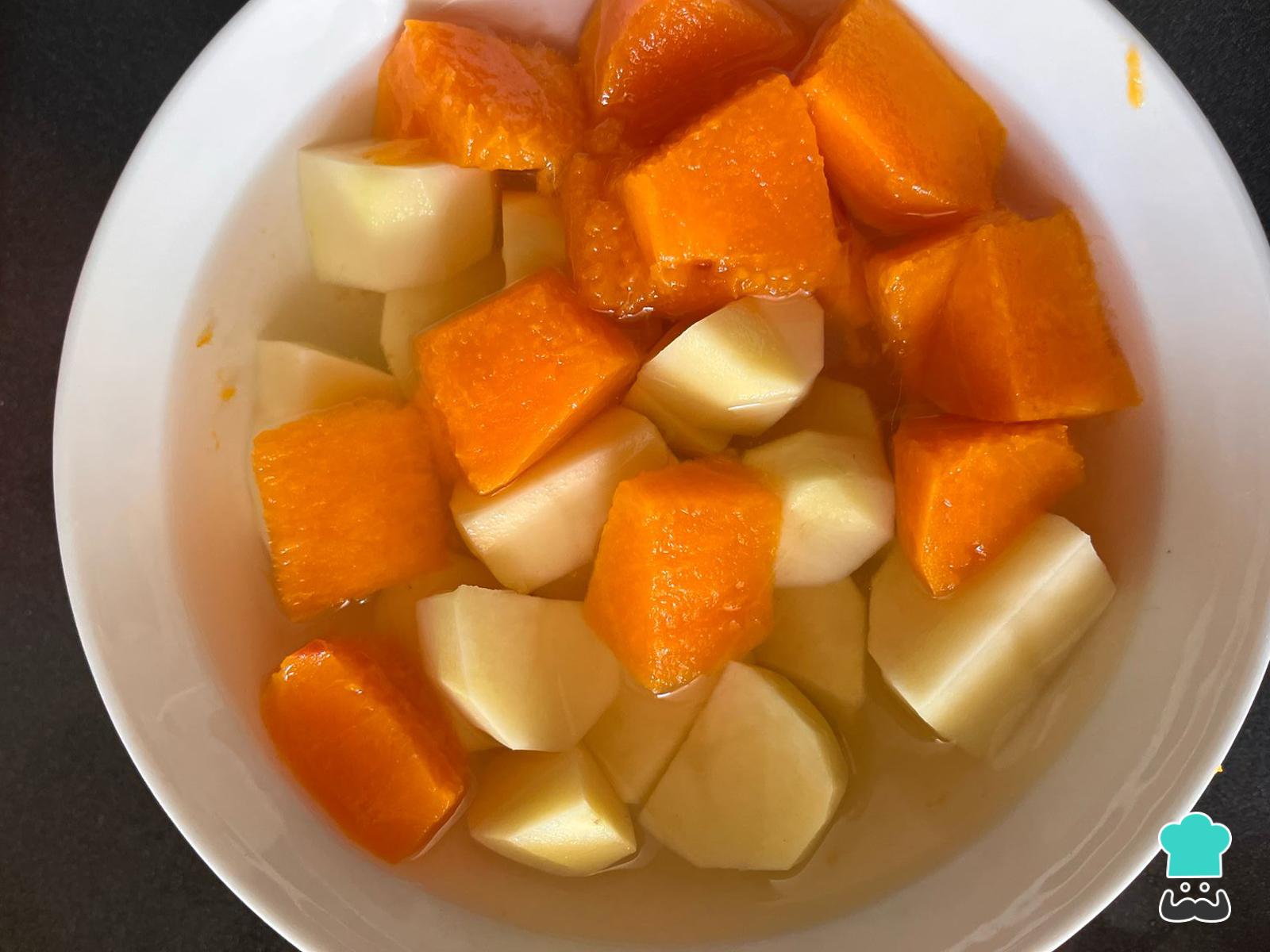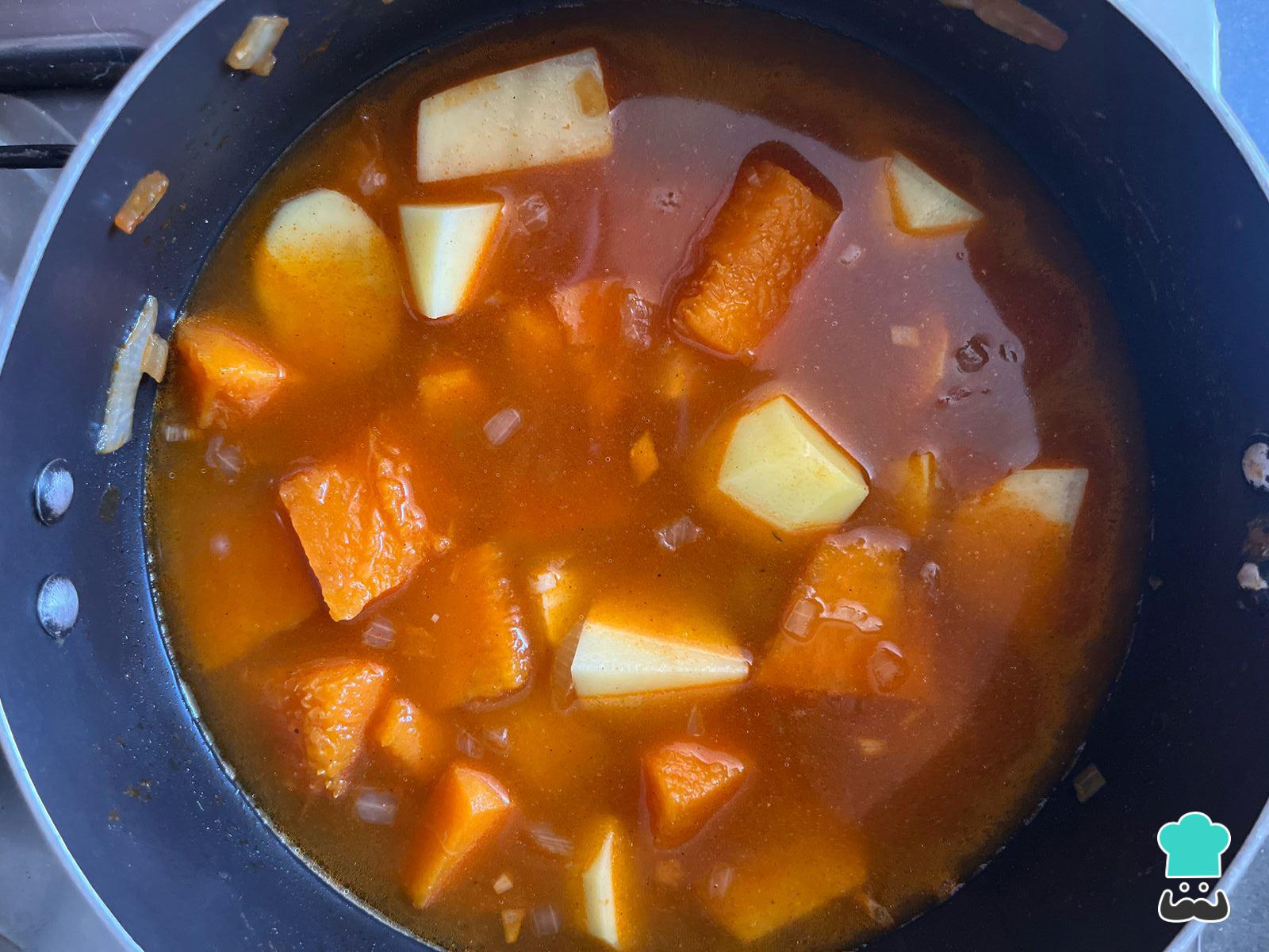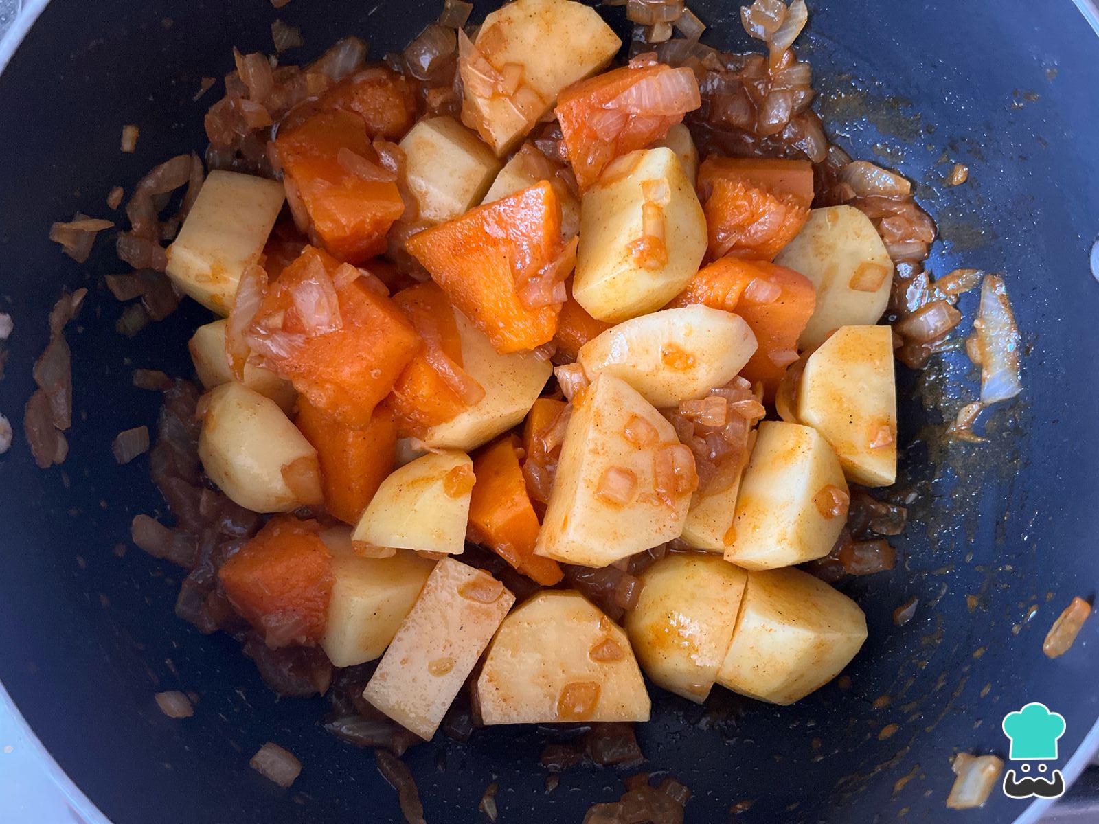 Incorpora las papas y el zapallo a la olla y revuelve para impregnarlas con el sofrito.