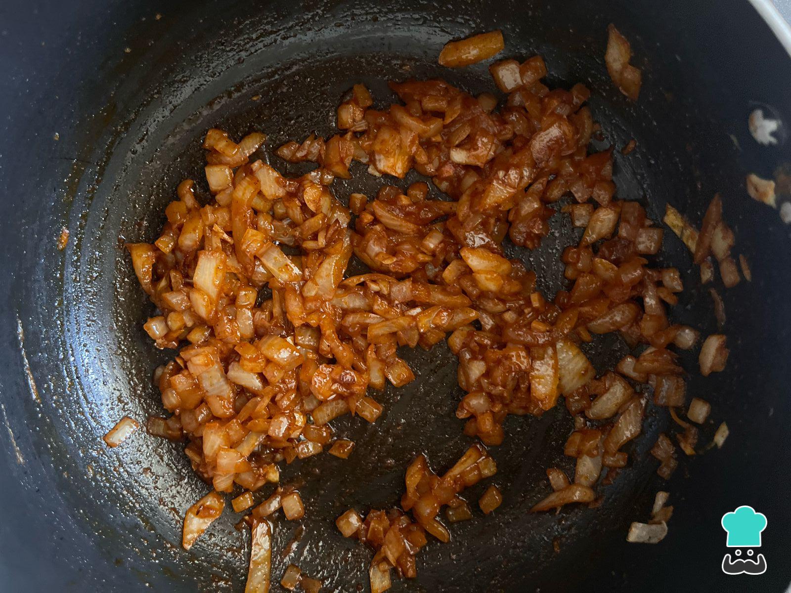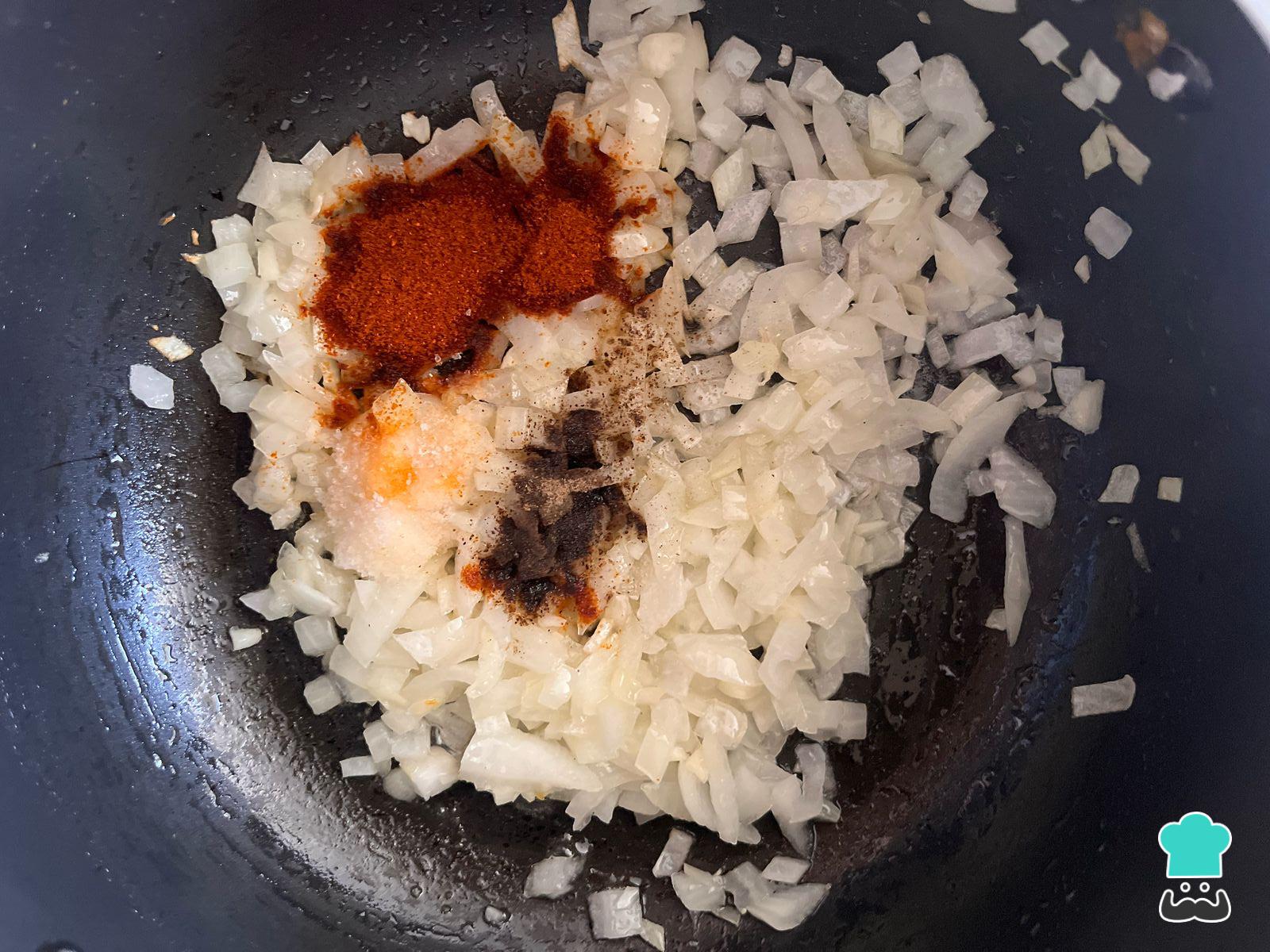 En una olla grande calienta el aceite y sofríe la cebolla junto con el ajo hasta que estén dorados. Agrega el ají de color, sal y la pimienta.