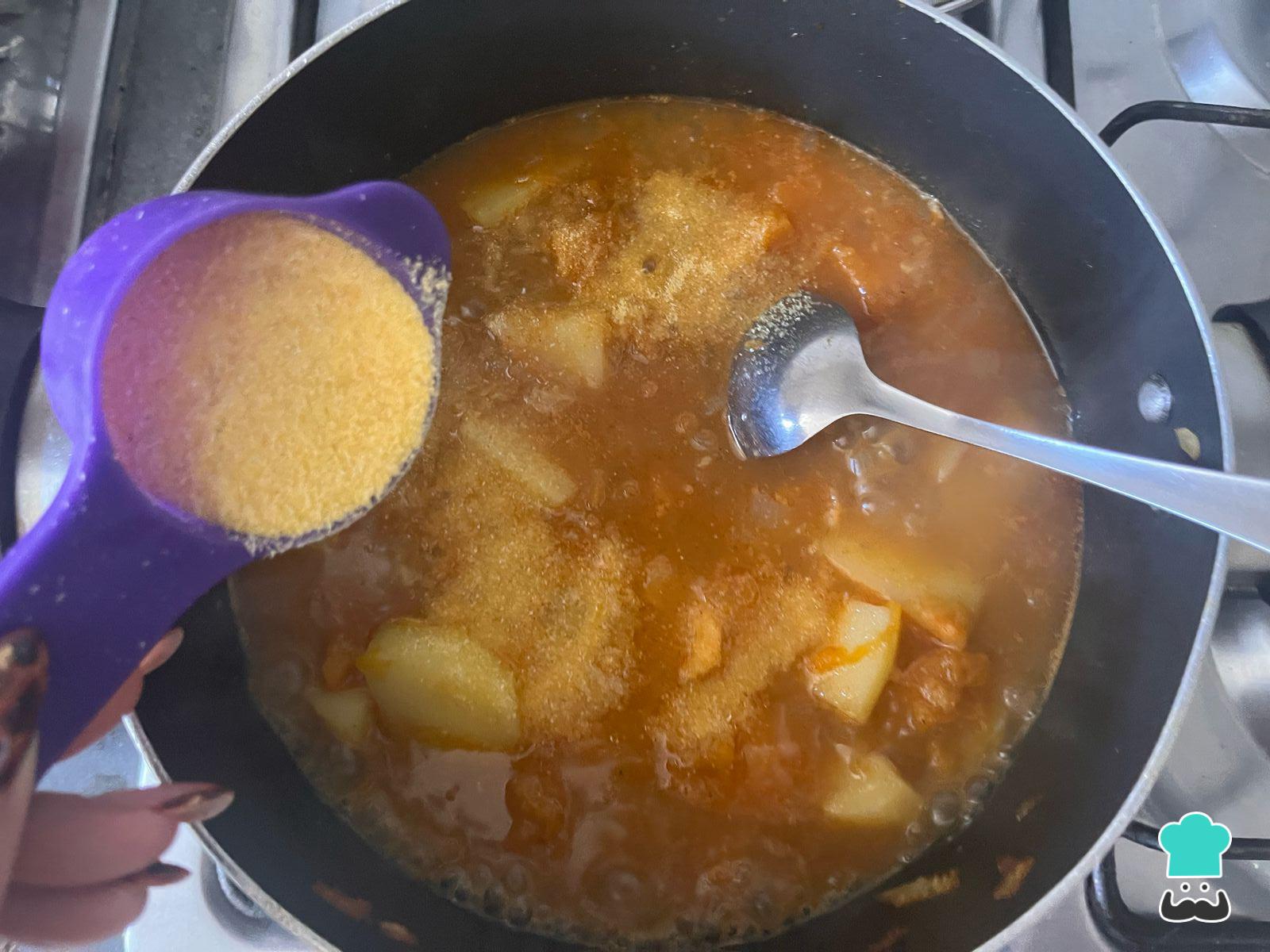 Cuando las papas estén cocidas, agrega la chuchoca a la cazuela en forma de lluvia mientras revuelves constantemente para evitar grumos.