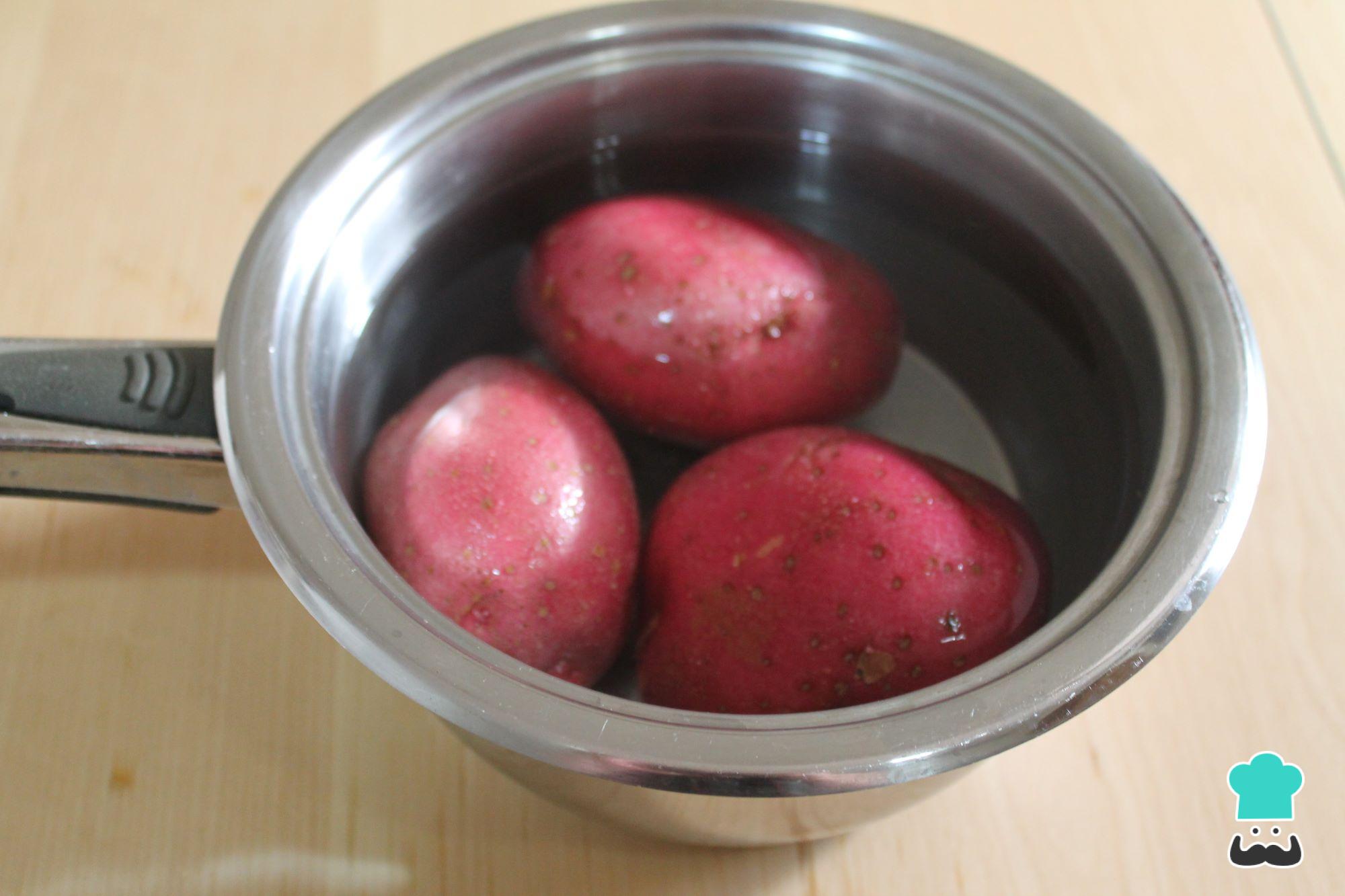 Para hacer la receta de las papas rústicas rápidas, primero lava las patatas retirando los posibles restos de tierra. Luego, añádelas en una olla amplia cubierta de agua con un poco de sal común y lleva a ebullición. Hierve durante 10 minutos.